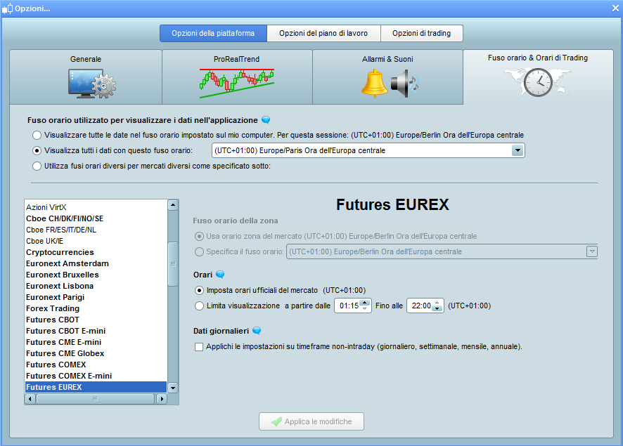 La seconda immagine mostra l’impostazione dell’orario di visualizzazione: gli orari impostati sono quelli ufficiali di mercato.