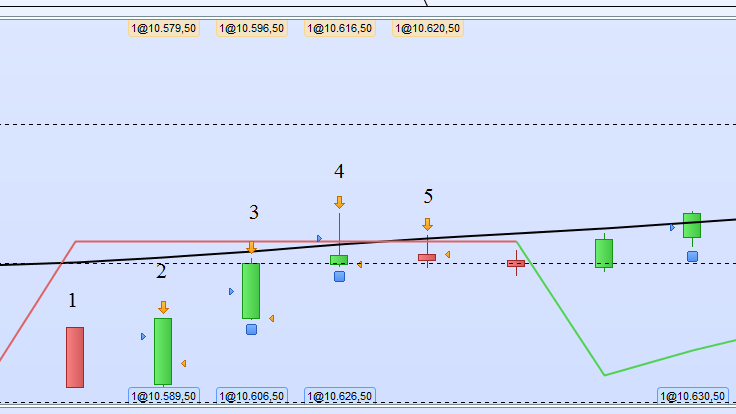 Finalmente, in candela 2, viene eseguito l’ordine di vendita a 10.522. Corretto!