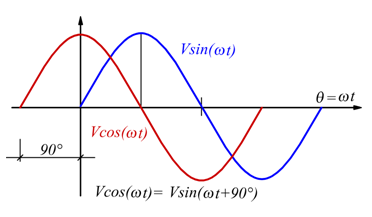 Un’altra cosa a proposito della variabile phase che indica la fase che tu vuoi attribuire alla funzione seno. Ti allego una figura che può aiutare a comprendere. La traccia bleu indica la funzione seno con fase zero gradi. La traccia rossa, invece, indica la funzione seno con fase pari a 90 gradi (la fase si misura in gradi o in radianti). Che poi corrisponde alla funzione coseno. Quando imponi una fase di 90 gradi è come se traslassi la traccia bleu, lungo l’asse del tempo (quello orizzontale, detto anche asse delle ascisse) verso sinistra di un quarto di periodo.