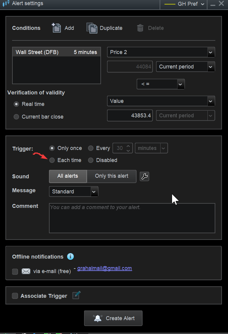 Also I have noticed where the market his hit my alarm level and it has not trigged? This is even when I select Trigger – Each Time.
