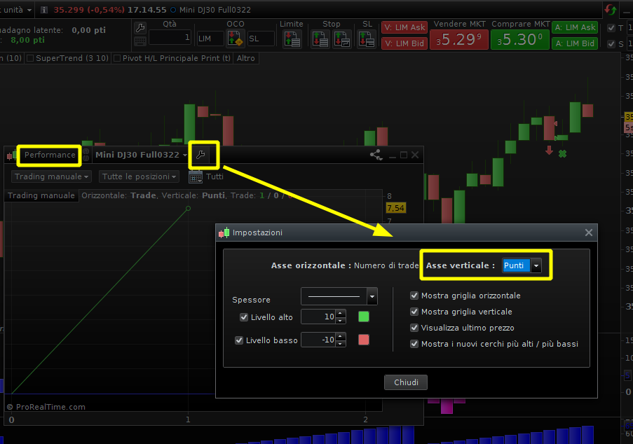 Salve, volevo impostare il grafico di Performance Prorealtime con i punti piuttosto che in valuta! sono andato su IMPOSTAZIONI > TRADING > VISUALIZZAZIONE ed ho impostato PUNTI come da file allegato ma mi setta i punti solo sui grafici e non sulle performance!?