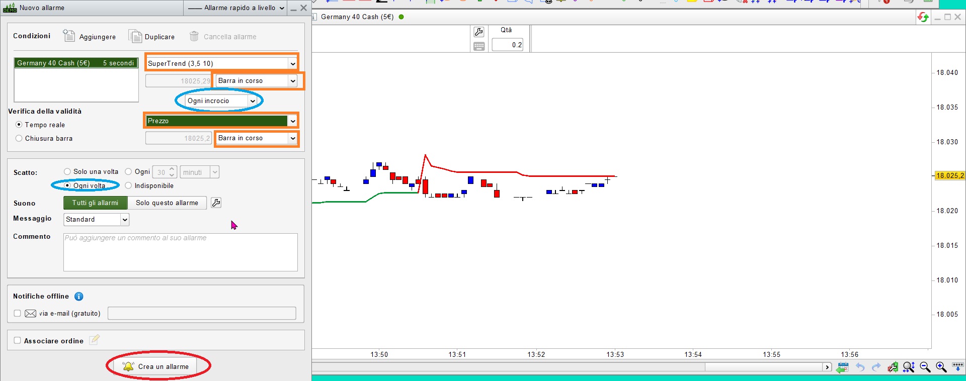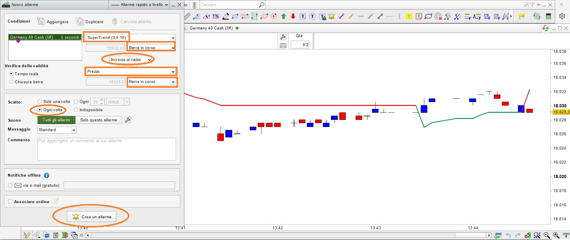 Volevo chiedere qual’è la procedura corretta per creare un alert che mi avverti ogni volta che l’indicatore SuperTrend passa da Rialzista a Ribassista.
