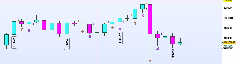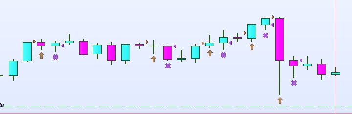 quindi: la candela di sabato è stata rialzista, quella di oggi domenica se dovesse chiudere ora, per esempio, sarebbe ribasssista