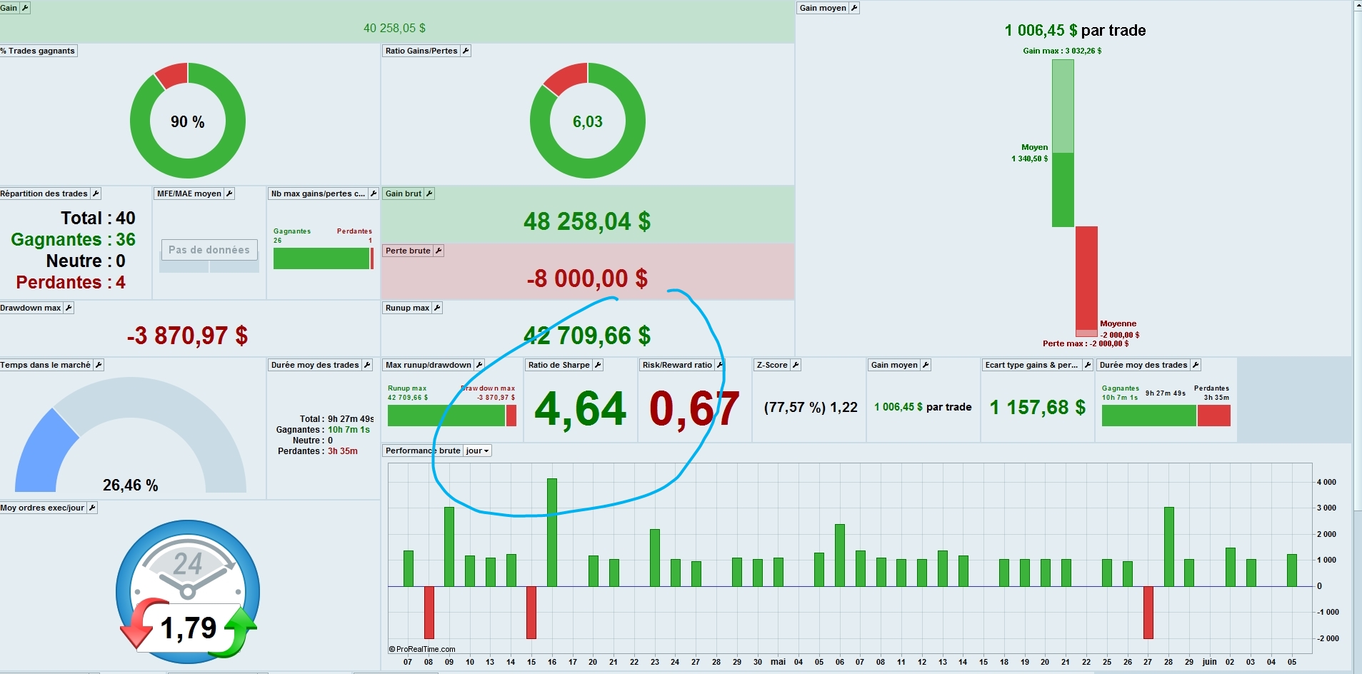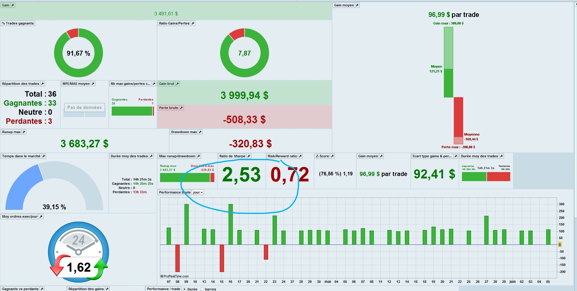 As you can see, with quite the same number of trade, we can have very good sharpe ratio even with a small gain (+34 % only)