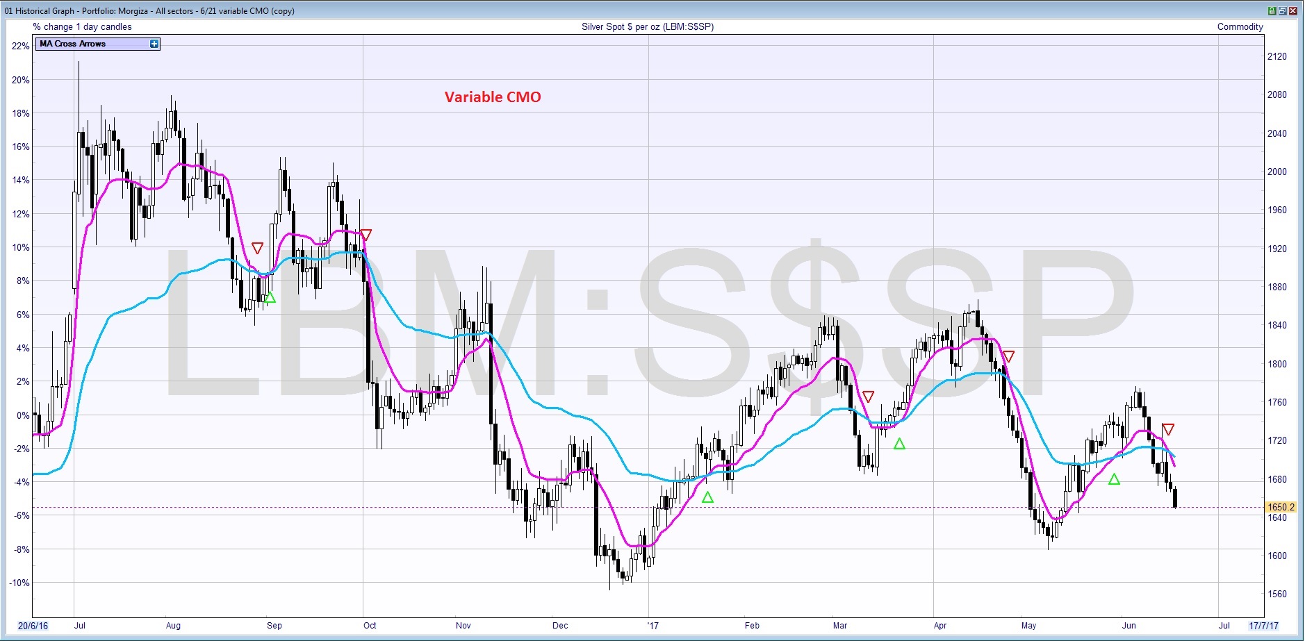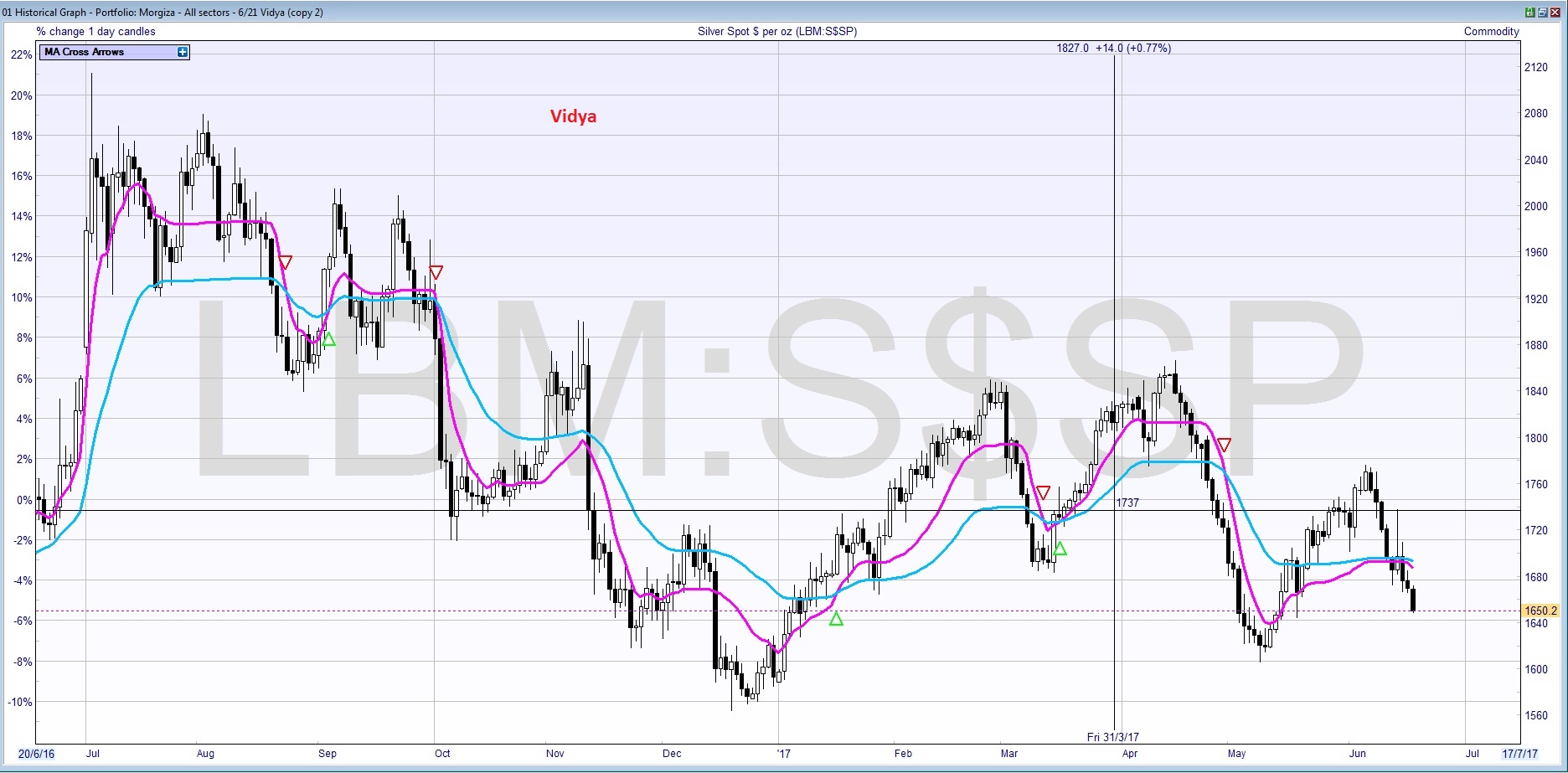 Thanks Nicolas. Here’s Silver Spot, daily bars, 1 year 20/06/2016 to 20/06/2017, 6 and 21 period moving averages. Quite volatile so a good example I think. Somewhat similar in result to Vidya (Sharescope version). I’ve attached both VCMO and Vidya charts. Thank you.