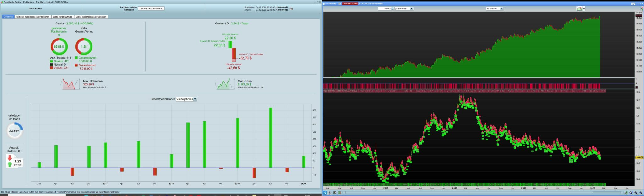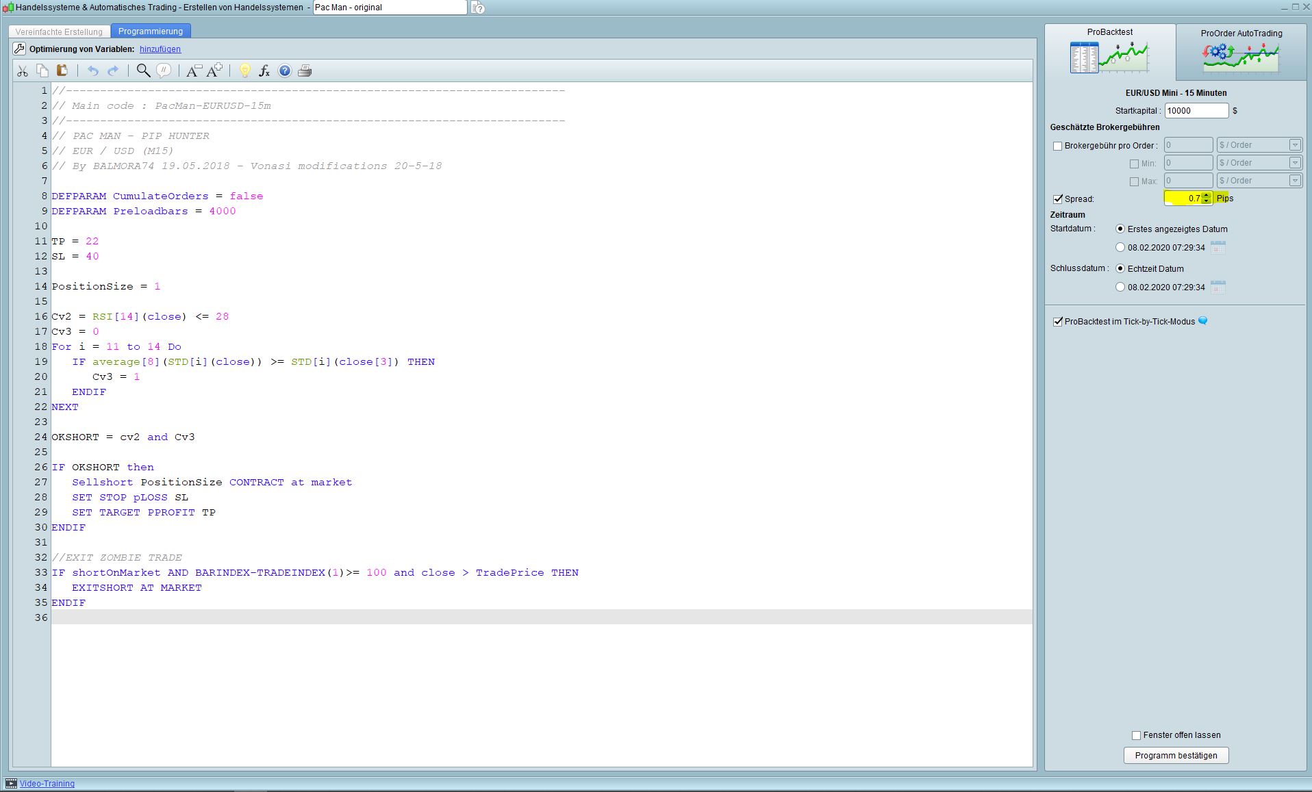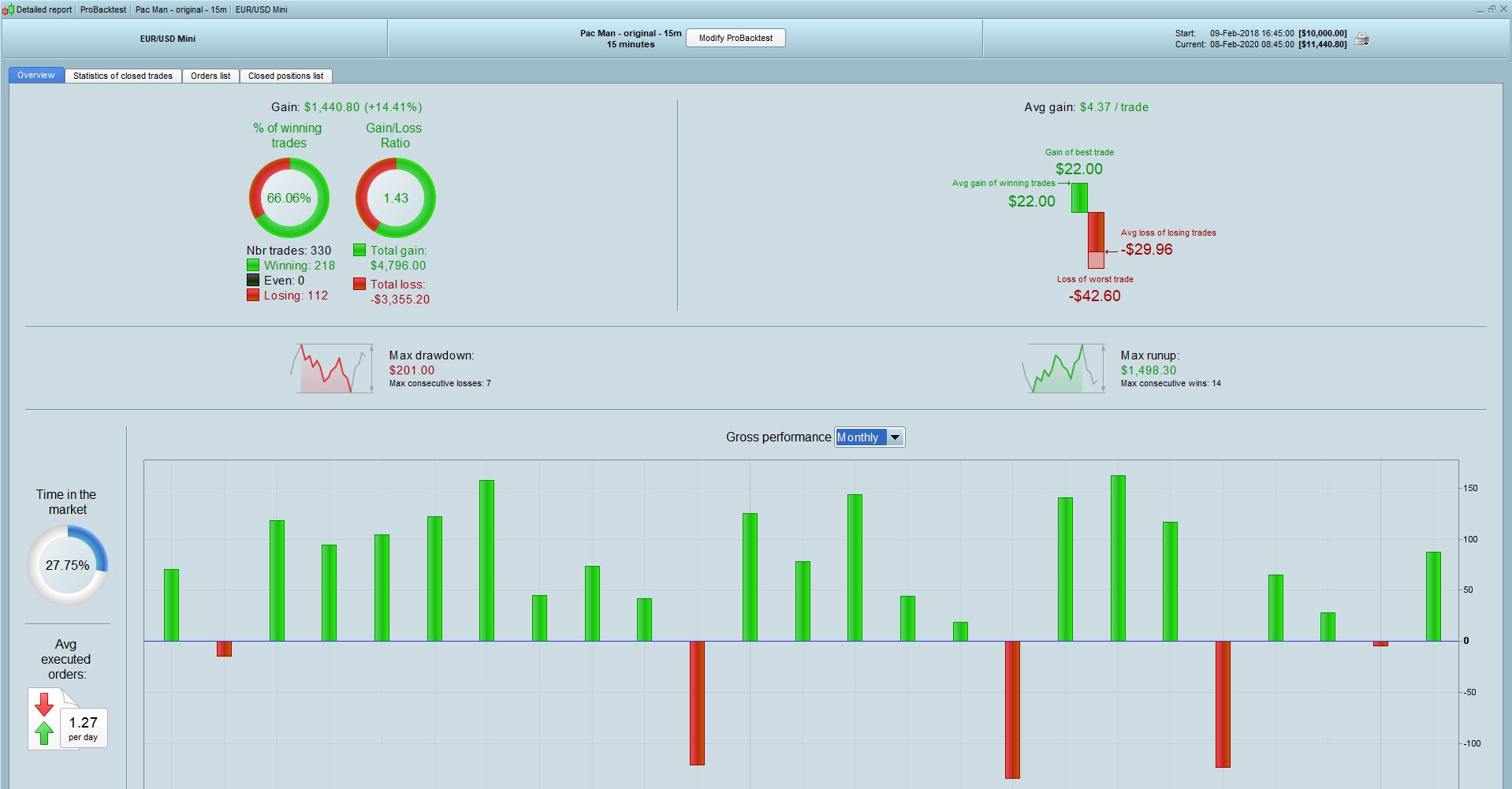 NB: I am using a spread of 0.7. I have several versions of PacMan running in demo mode and they all look successful so far but that one somehow seems to generate the best balance between profit/trade, winning ratio, drawdown and regularity. I am just wondering if that remains successful before 2018 in a different EUR/USD context…