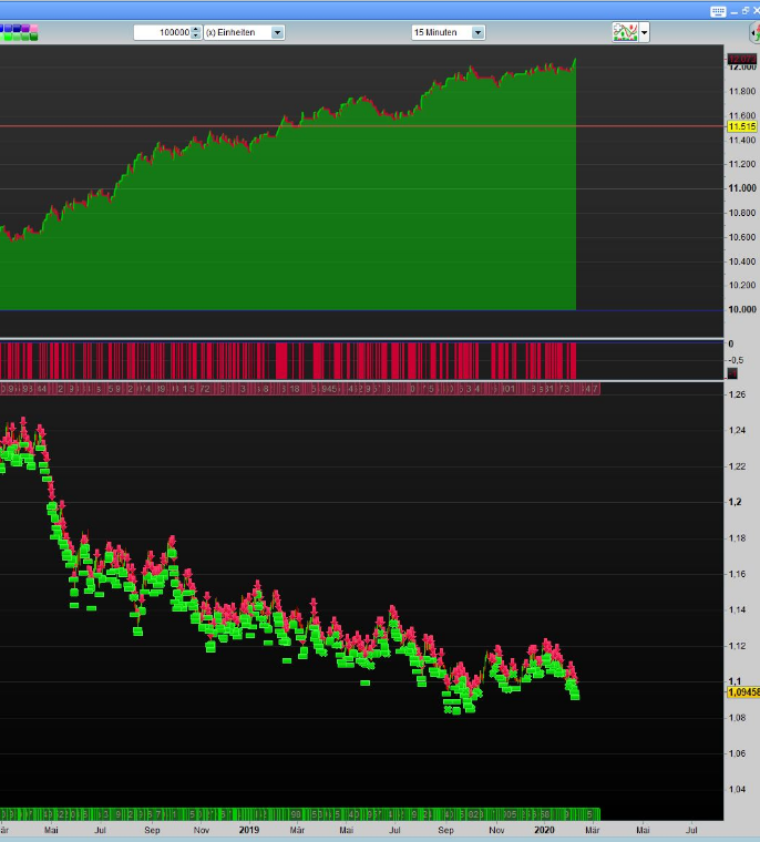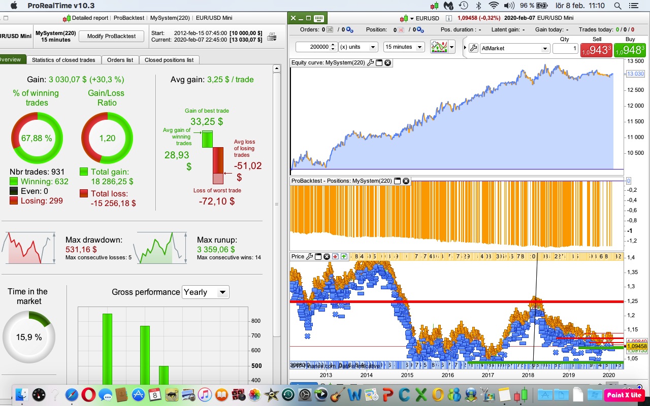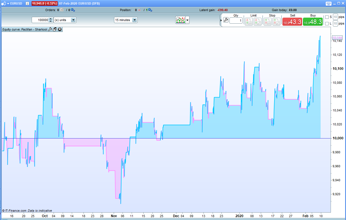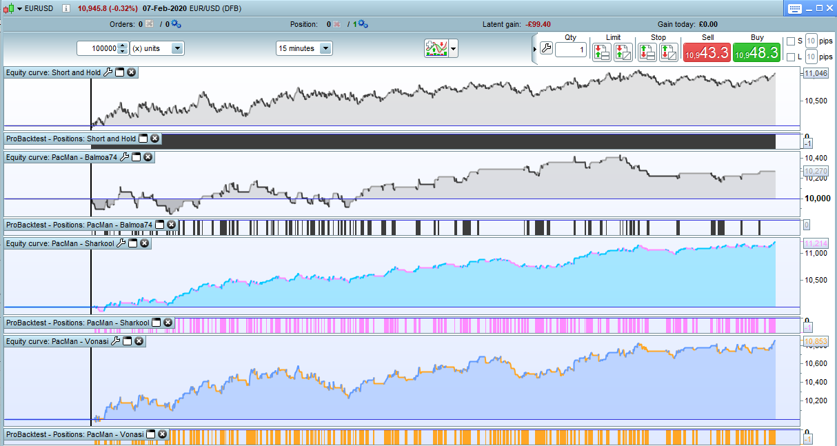 As far as I recall both versions were in profit but my modified version was winning by some way. I had not paid much attention to them as the the EUR had been in a downward trend during the whole forward test and as they are a shorting strategy I did not feel that they had been fully stress tested. The 200k results look pretty good though. Some periods of drawdown during strong upward trends but otherwise pretty nice. We also have to consider the benefit of getting paid overnight fees which cannot be shown in these results.