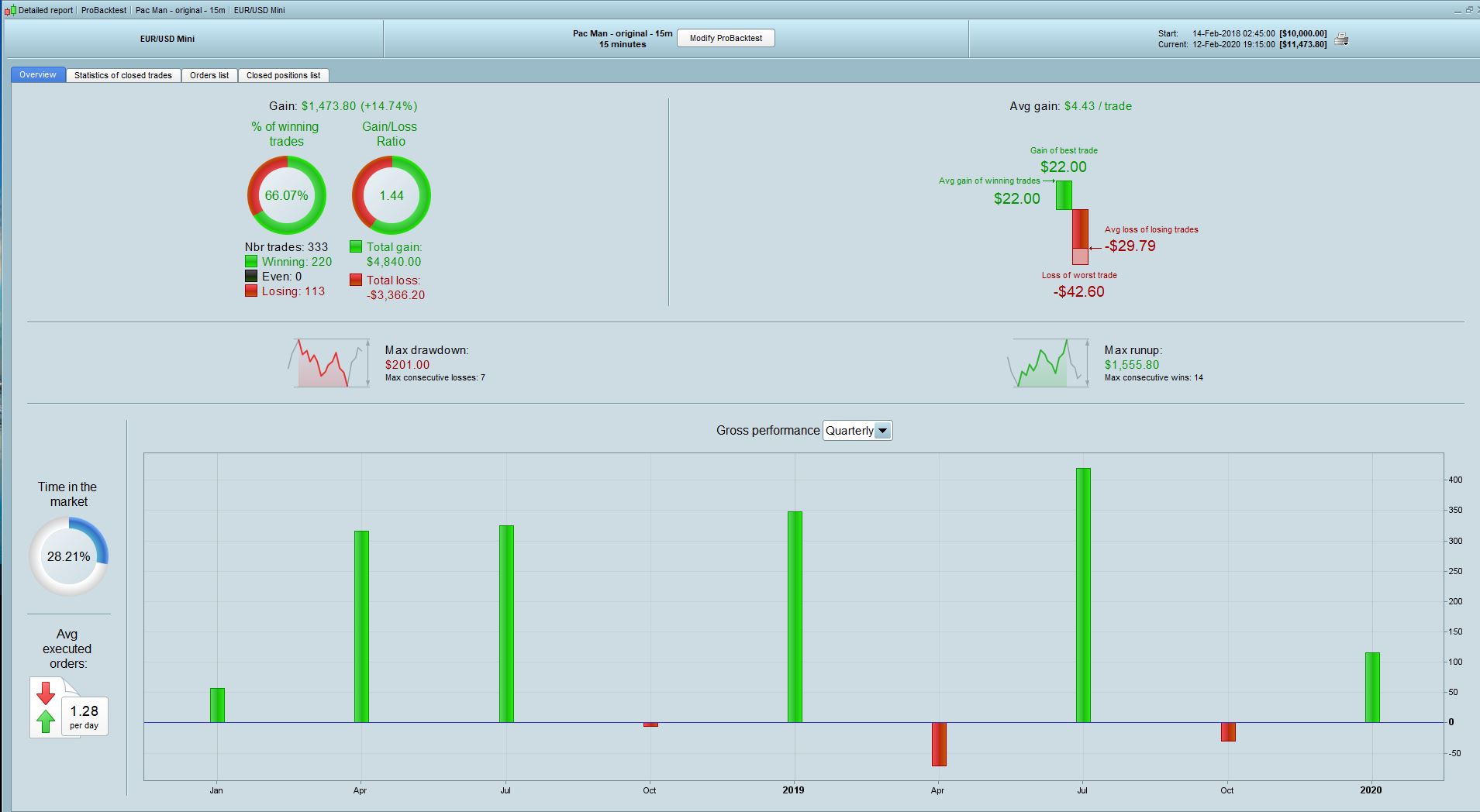 @Vonasi, yes indeed it is your modified version which i have tried with various parameters. Looks like i ended up changing only the profit/loss targets that are more in line with my profit management. I was hoping that the strategy would behave correctly in 2017 and thanks to the 200k test it doesn’t look too bad.