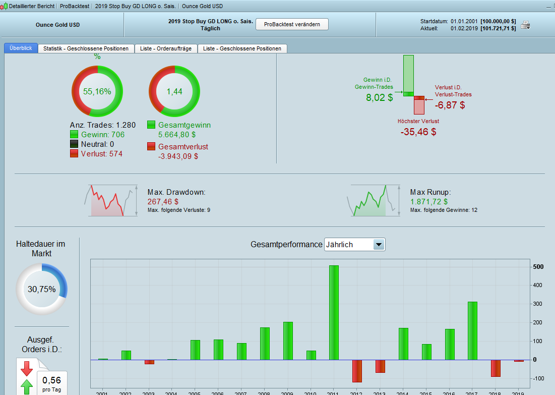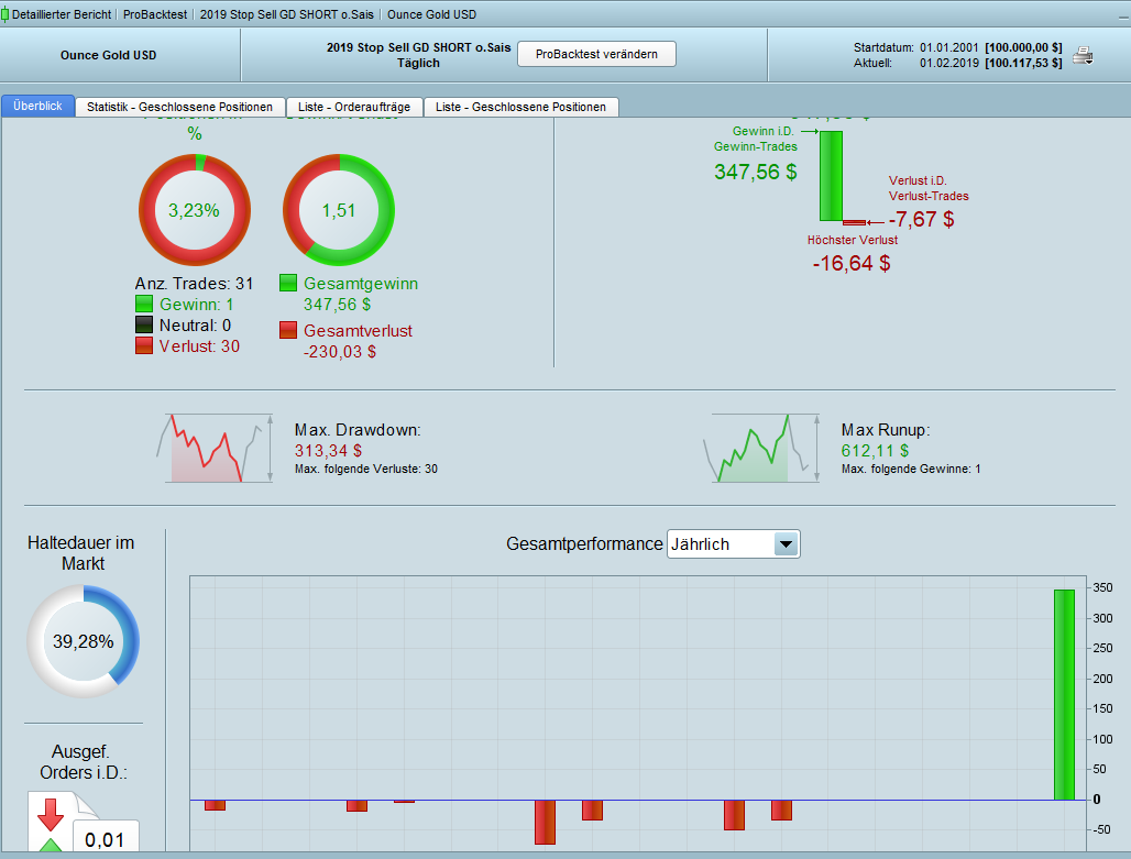 Long wird auch genauso durchgeführt, wie beabsichtigt. Wenn ich jedoch die Vorzeichen umdrehe für die Short-Trades, werden Positionen nicht so wie beabsichtigt geschlossen, sondern viele Positionen bleiben einfach unzählige Bars lang offen, obwohl die Bedingungen zum Schließen längst eingetreten sind und die Postition geschlossen werden müsste.