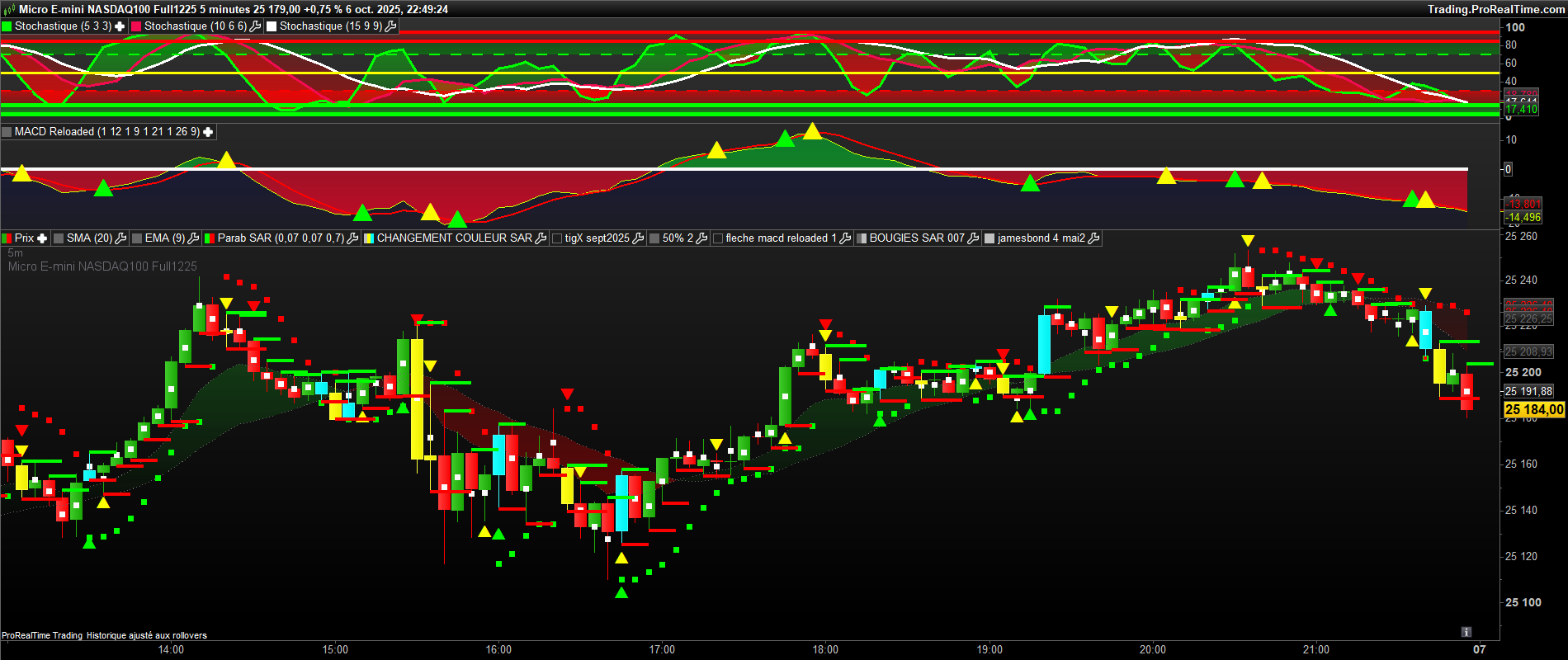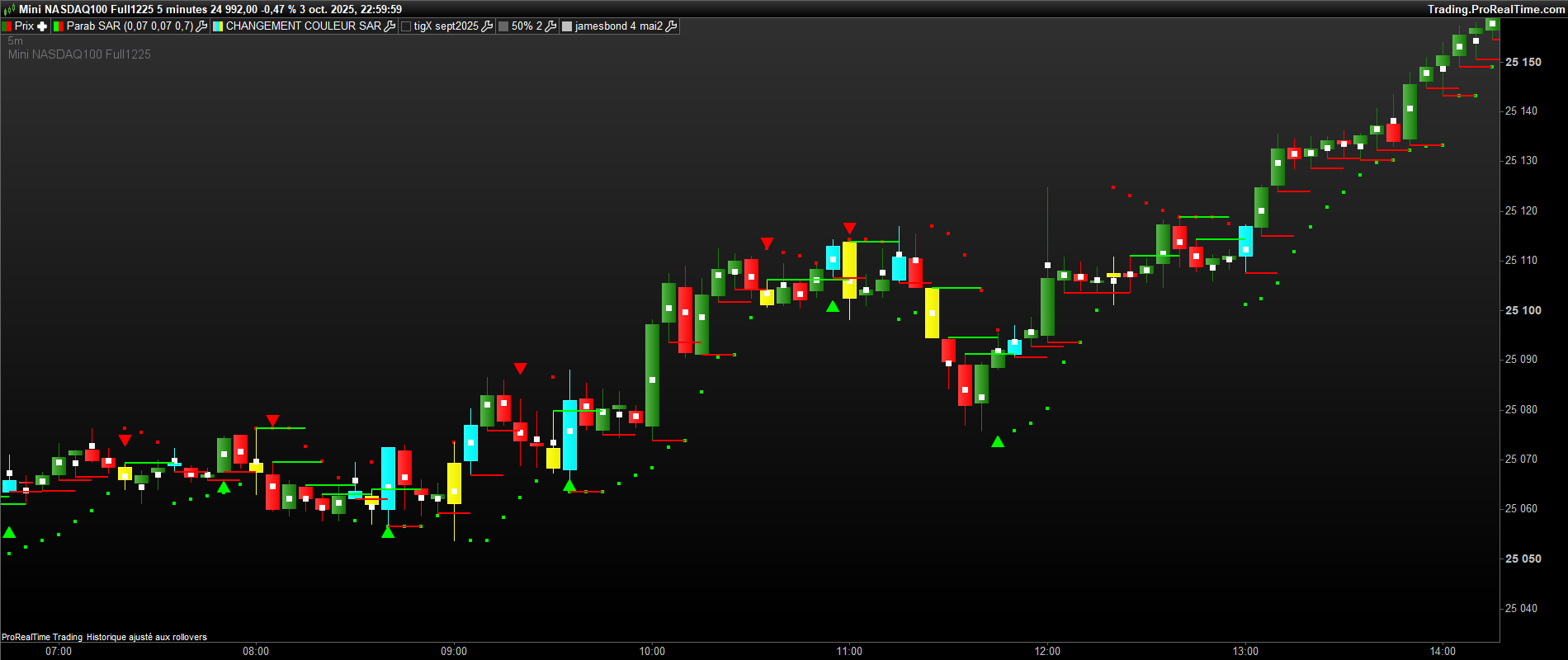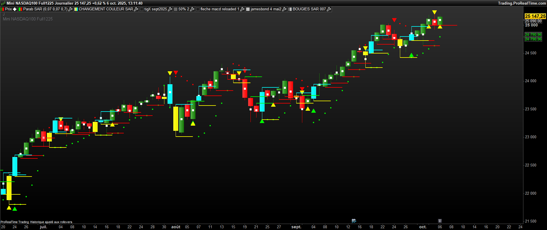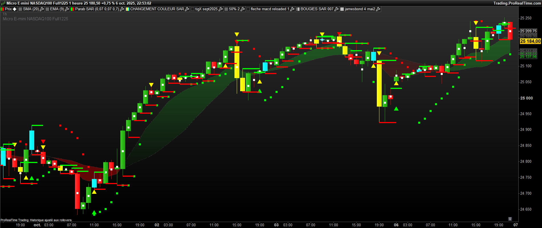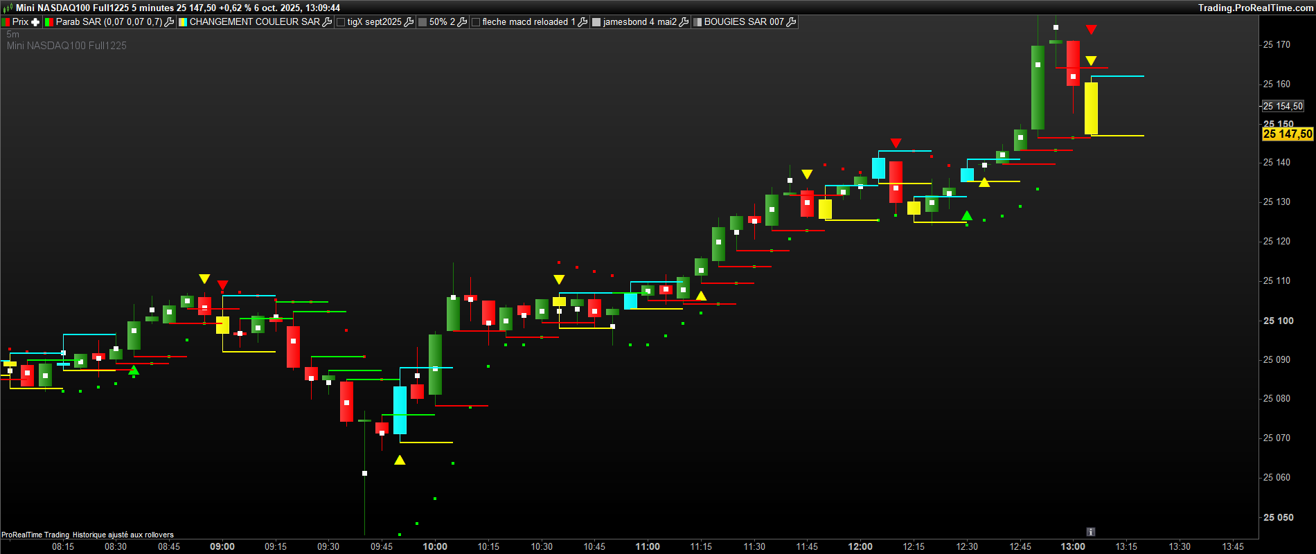 bonjour, sur ce graphe , il y a des bougies jaunes ( 1ere bougie de retournement baissier du sar 0.07 ) et des bougies bleues( 1ere bougie de retournement haussier du sar 0.07 . il y a deja des traits verts et rouges ( buy>vert et sell<rouge). Mais pour confirmer des siganux, j aimerai avoir des traits bleu ciel et jaune sur chaque bougie bleu et jaune ( bleu ciel =buy sur le plus haut d’une bougie jaune et sell sur le plus bas et inversement sur une bougie bleue , mettre un trait bleu ciel sur le plus haut et jaune sur le plus bas de la bougie bleue. Merci bien.