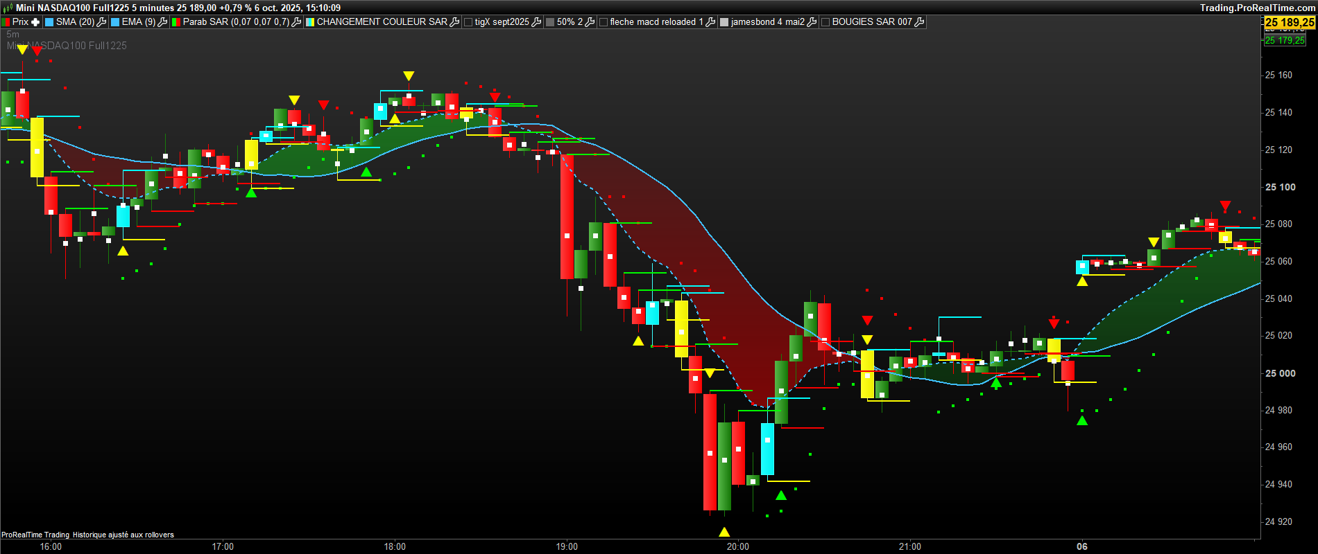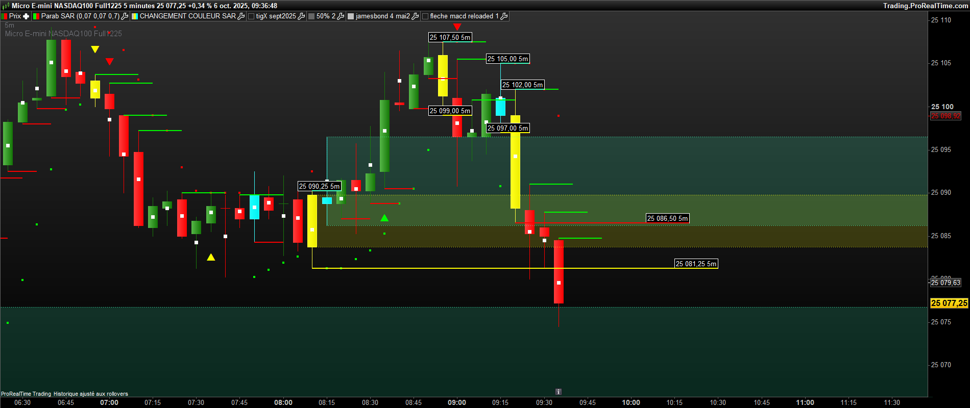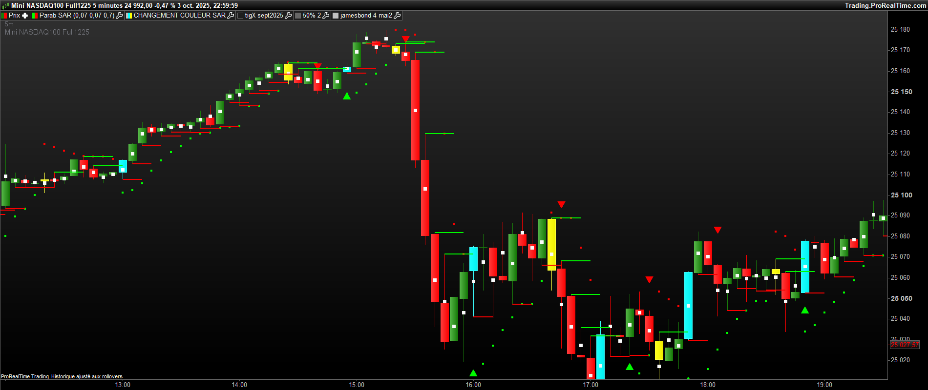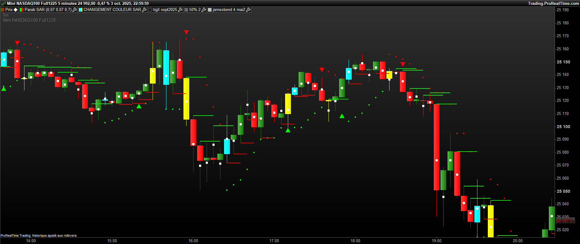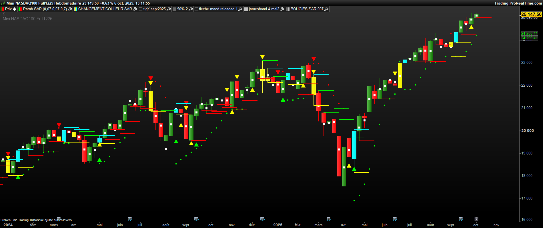 bonjour, sur ce graphe , il y a des bougies jaunes ( 1ere bougie de retournement baissier du sar 0.07 ) et des bougies bleues( 1ere bougie de retournement haussier du sar 0.07 . il y a deja des traits verts et rouges ( buy>vert et sell<rouge). Mais pour confirmer des siganux, j aimerai avoir des traits bleu ciel et jaune sur chaque bougie bleu et jaune ( bleu ciel =buy sur le plus haut d’une bougie jaune et sell sur le plus bas et inversement sur une bougie bleue , mettre un trait bleu ciel sur le plus haut et jaune sur le plus bas de la bougie bleue. Merci bien.