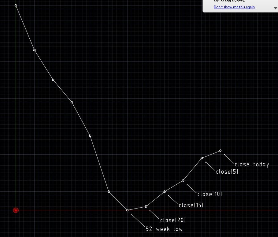Not having much luck with trying to find 52 week lows in last 4 weeks, then sieve through them for incremental rises one week at a time (52 week low < close[15] and close [10] > close [15] and close [5] > close [10] and close [0] > close [5] …….if you get my drift.