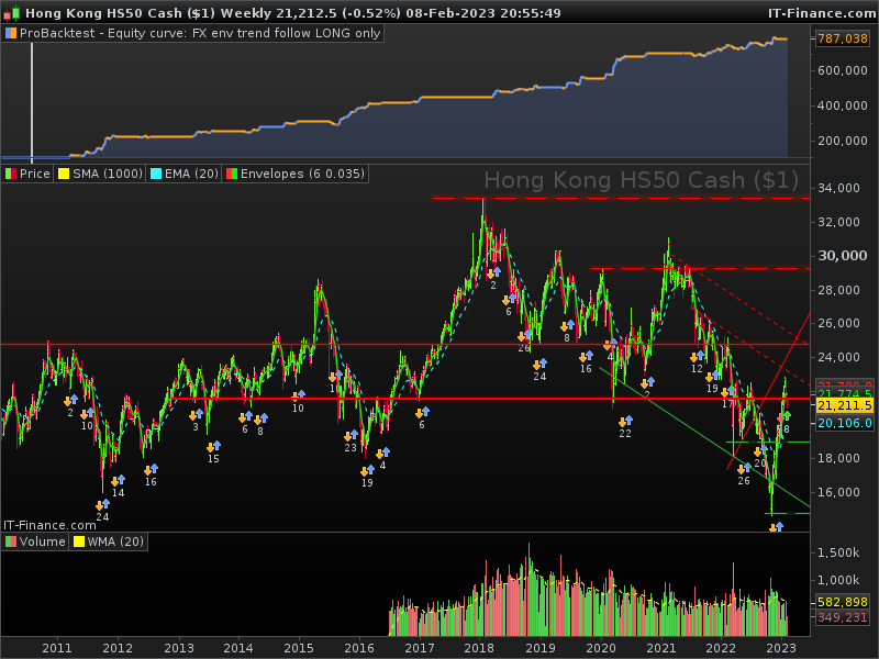 Here I have a long only based on an Envelope indicator. The results look good across various indices with HK50 giving a 3.68% Draw down for an average 17%pa return. I would not run this monster size of 20USD contracts.