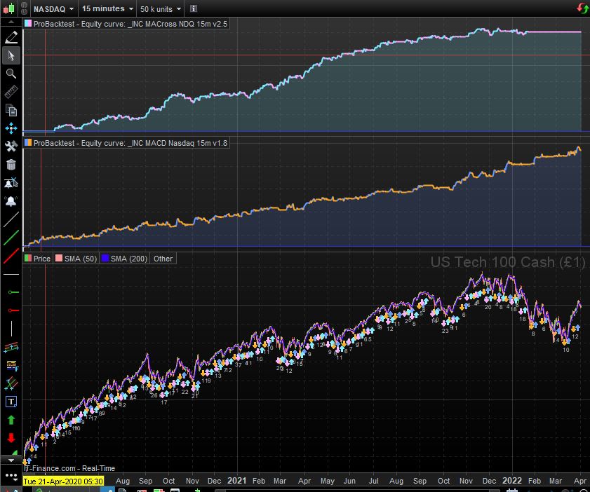 To provide an example, here are two strategies. The top equity curve is for the MA Cross that I’ve posted before, the second is the revised version of your MACD strategy that I posted the other day. I like that the MA Cross has stayed out of the market since mid Jan, as the filters kicked following a more extreme move downturn in the market.