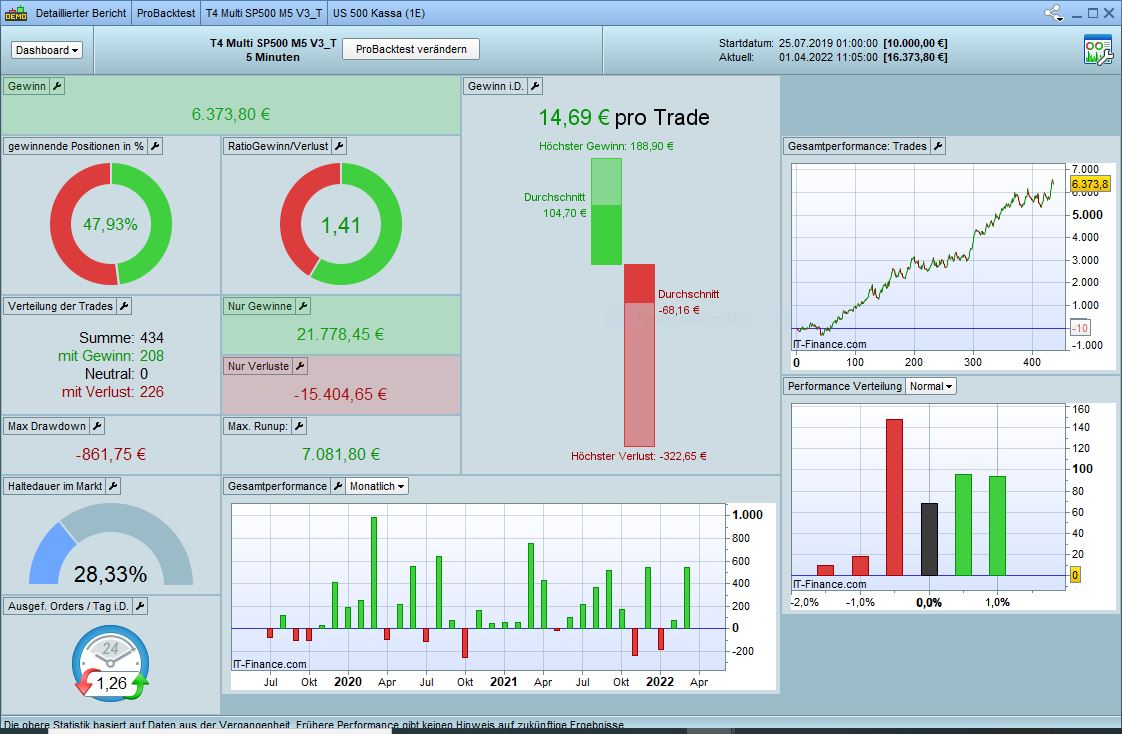 Now I took time blocks of 3-6 months from the past quite randomly and optimized them. So the smaller momentum trend and money management. Then take these values and just look at the complete 200,000 candles. Lo and behold, the system always remains positive, in the past before the optimized period and also in the future. It was best if the optimized period included the extreme values of Corona. And, still important to me, wins outweigh losses. So hit rate around 50%.