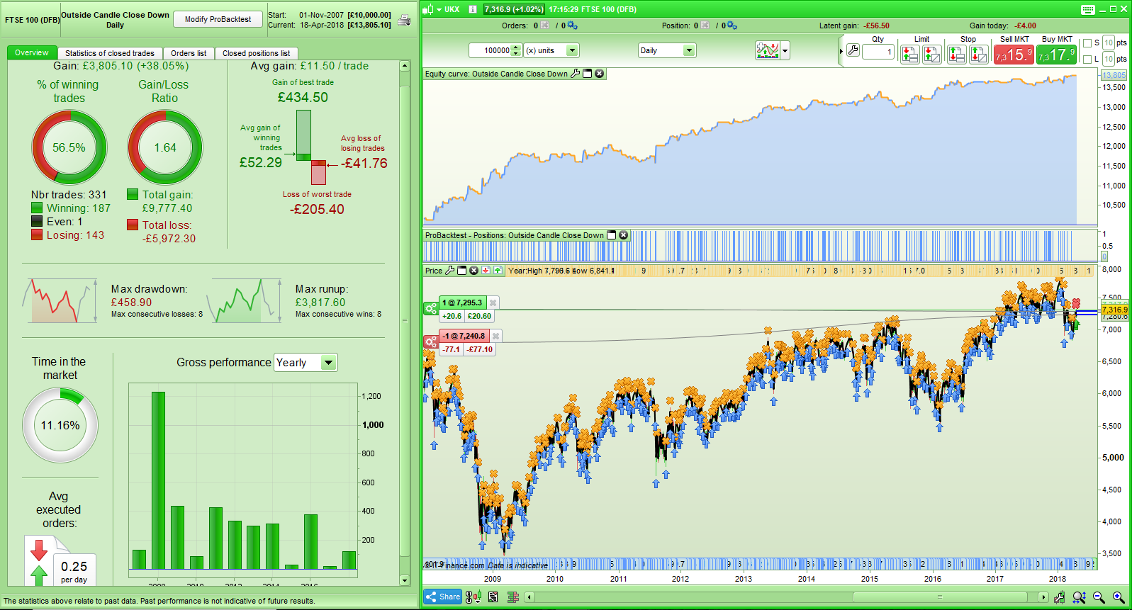04/18/2018 at 6:11 PM #68712I try not to get involved in shorting indices as you are fighting a long term trend but it is interesting that this theory of buying only has worked in down trends since Nov 2007.