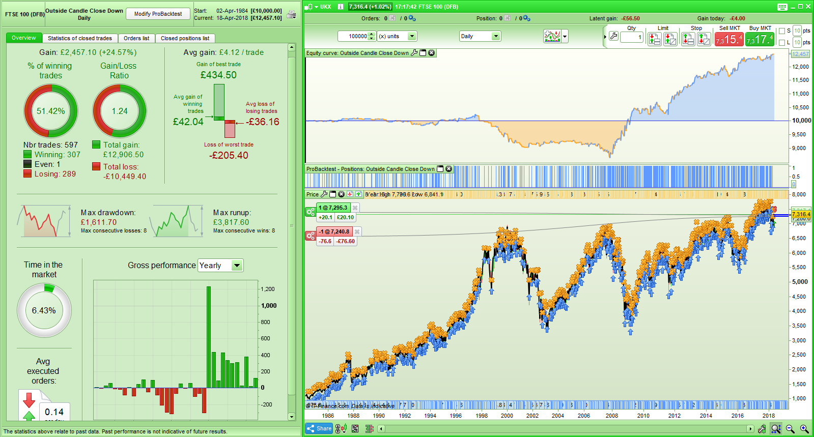 123456789DEFPARAM CumulateOrders = FalseIF High > High[1] and Low < Low[1] and close < open THENBUY 1 contract at MarketENDIFIF OnMarket THENSell at MarketENDIF04/18/2018 at 5:40 PM #68707What about short positions? Still working? Does the short strategy works before nov 2007? Does the result depend in the colour of the previous bar? Does it work in other time frame?