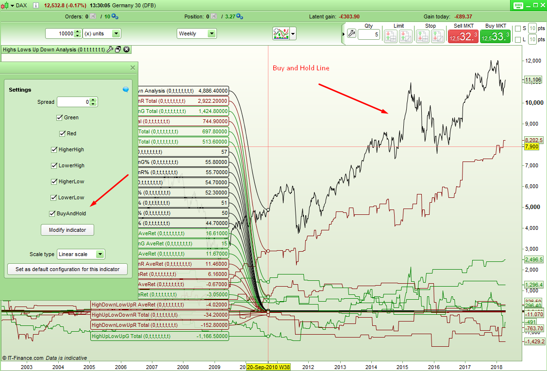 04/20/2018 at 1:36 PM #68870I’ve added a little code into my ‘Highs, Lows and Higher Close, Lower Close Analysis’ tool to allow it to show a buy and hold line to compare performance against. This can be switched off or on by ticking or unticking the box.
