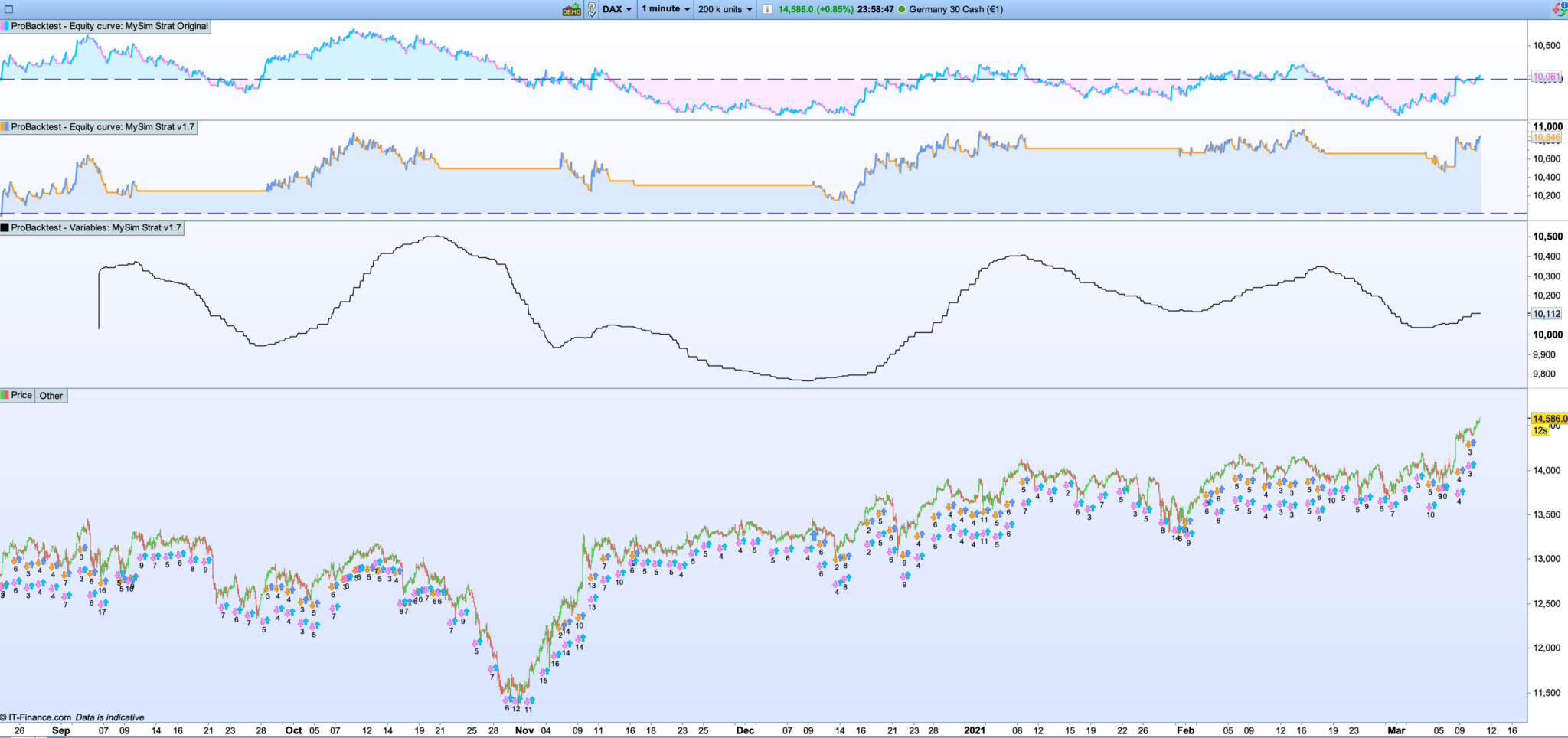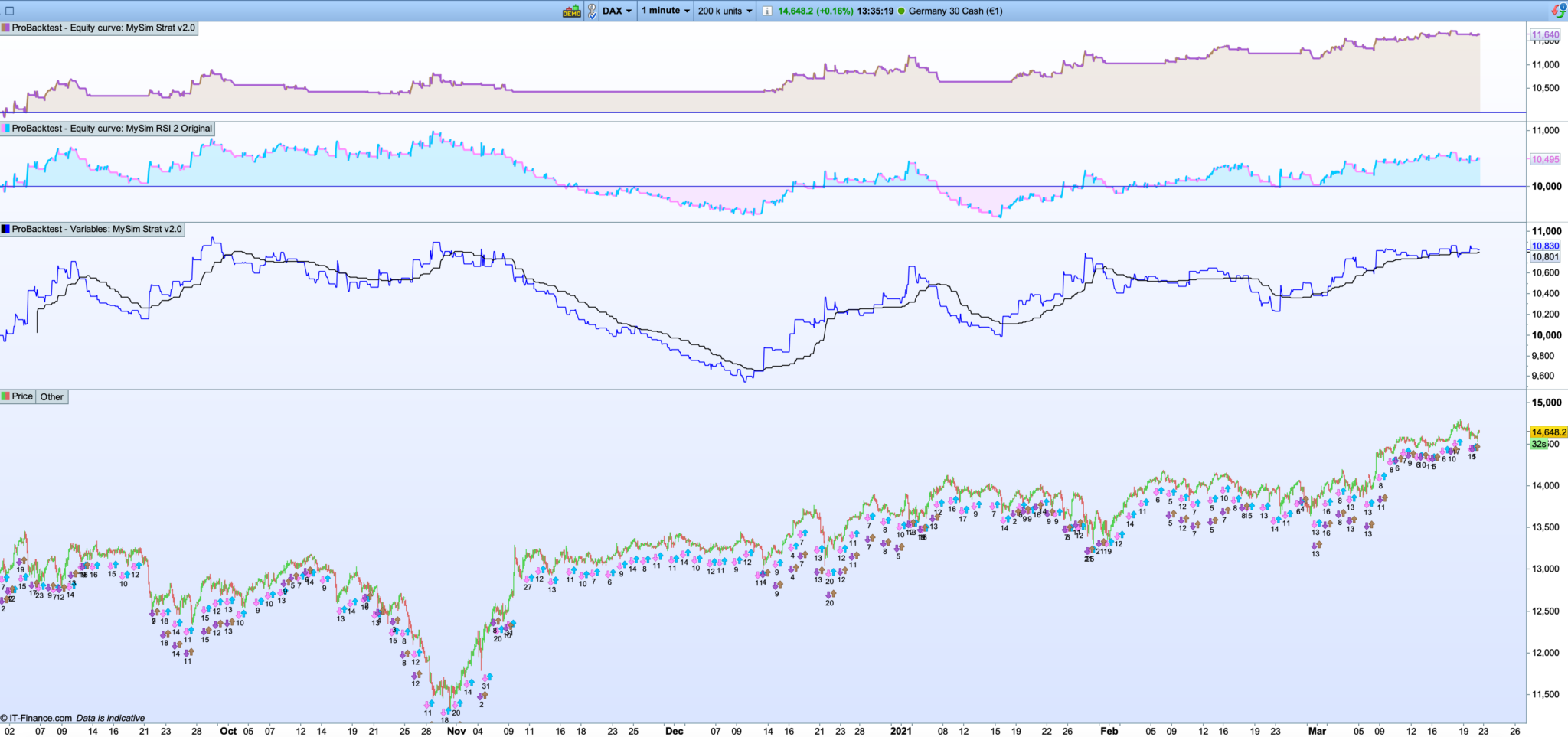 I have now added short trailing stop as well, so now it’s both long and short. I tested this on a simple RSI-2 strategy on 1 min timeframe on DAX. The conditions for stopping/starting the strategy is the same as my previous post.