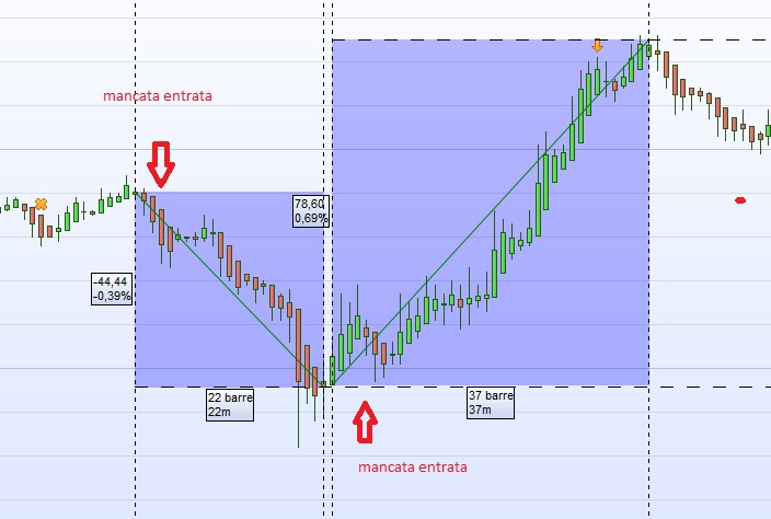 Nello screen 1 c’è una mancata entrata short con discesa di 45 pips e una mancata entrata long di circa 80 pips e addirittura una entrata short durante la fase rialzista.