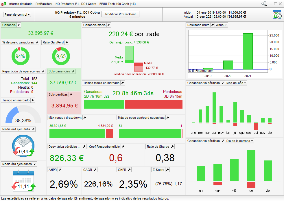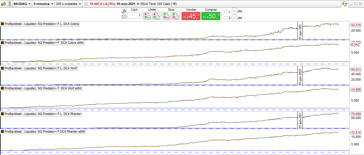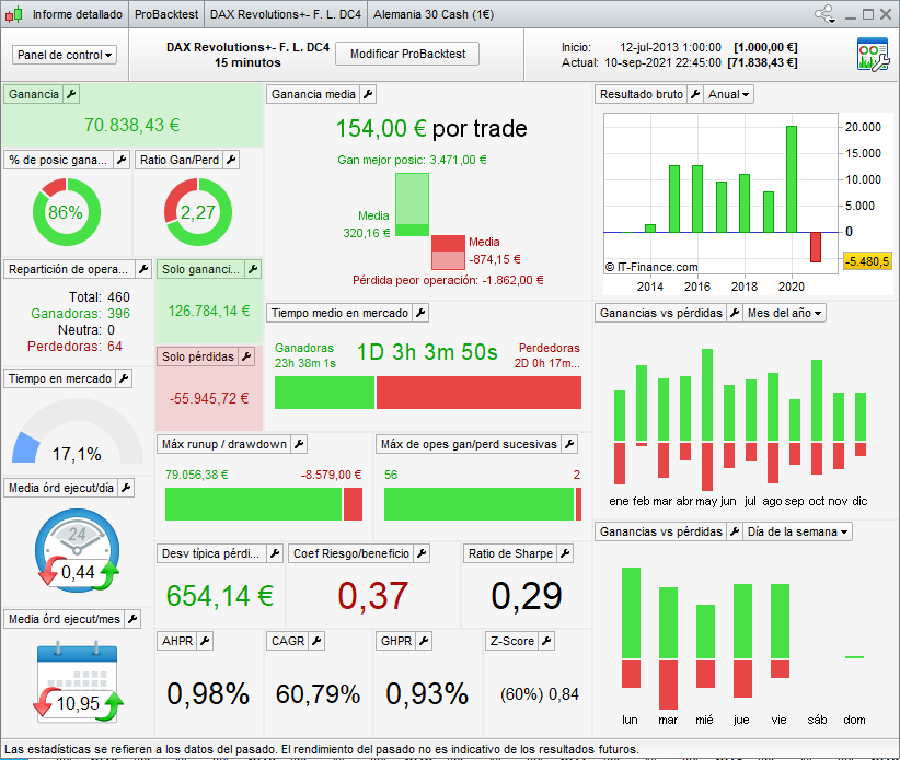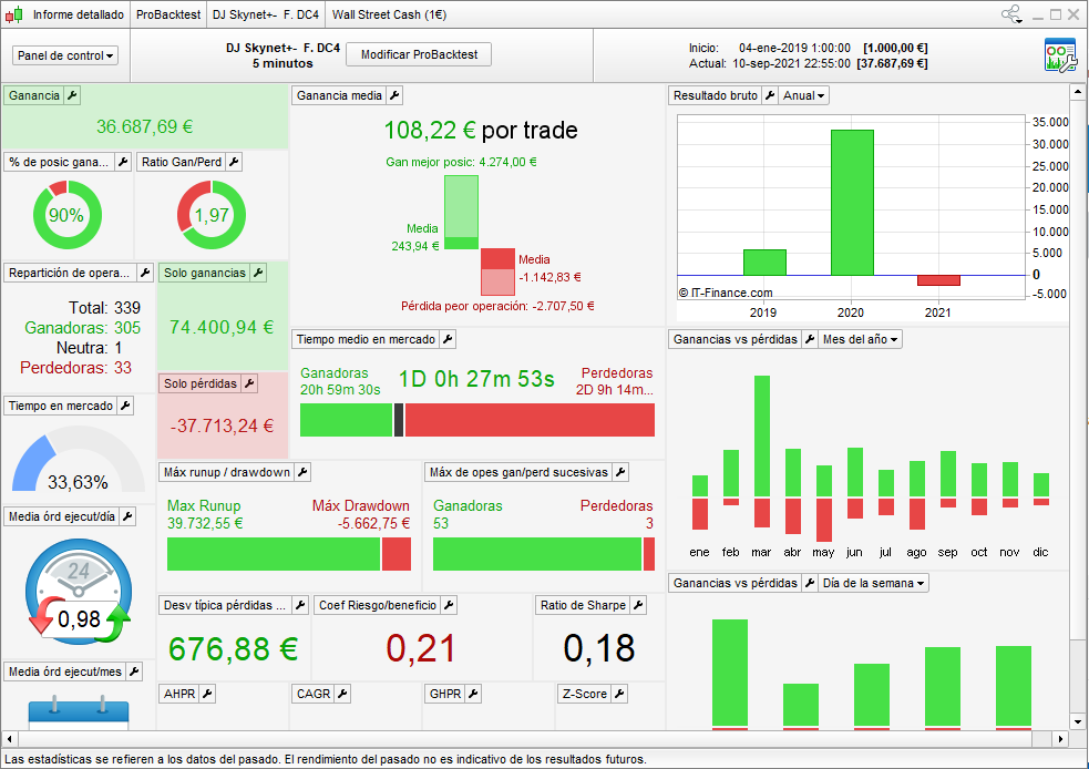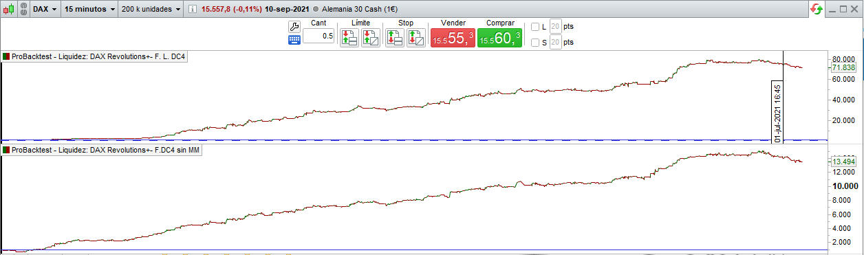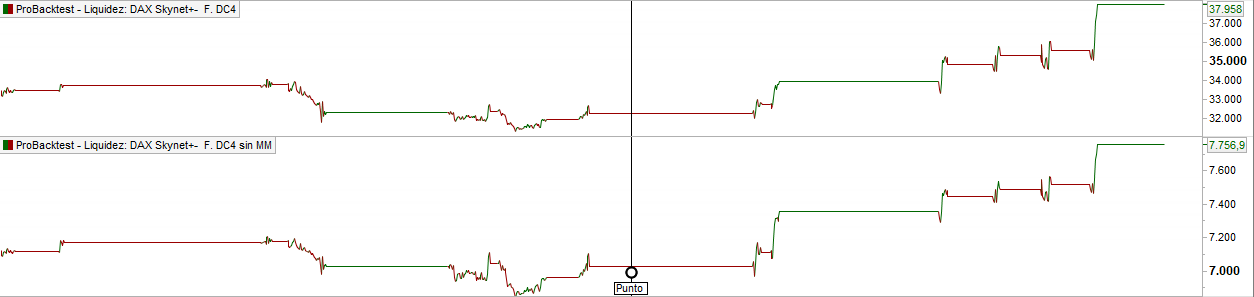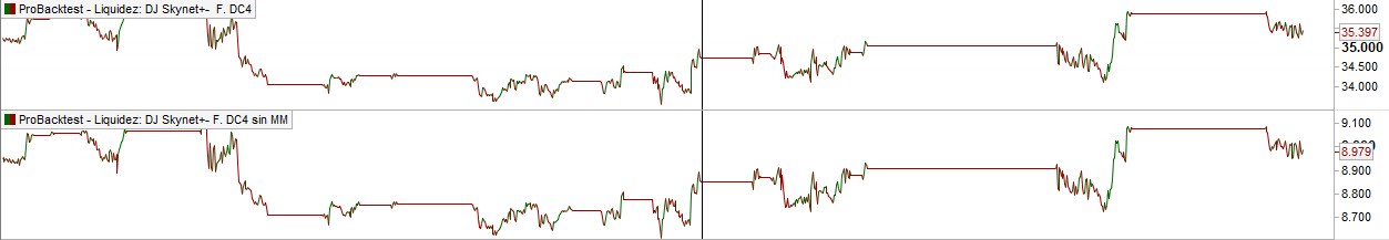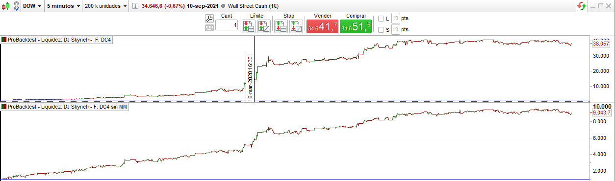 In the version WITHOUT MONEY MANAGEMENT, in the European DAX index (Germany), SKYNET and REVOLUTIONS trade with € 1 pip, in the US Dow Jones index, SKYNET trade with € 0.5 pip.
