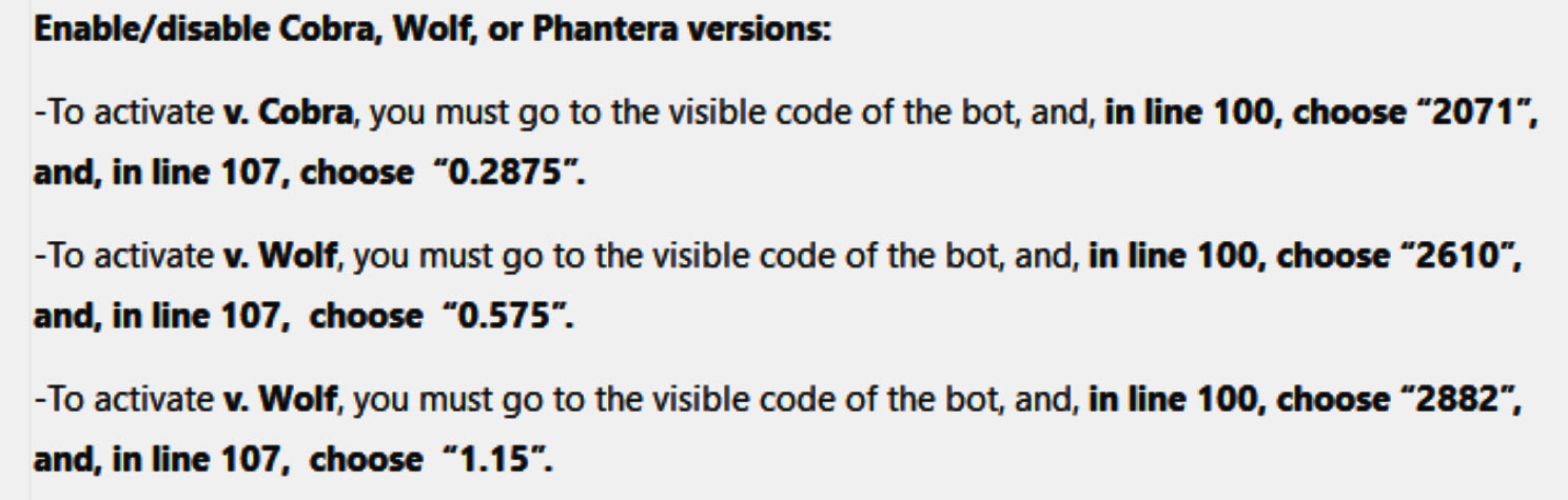 We have decided to integrate the Cobra, Wolf, and Phanter versions in a single bot.