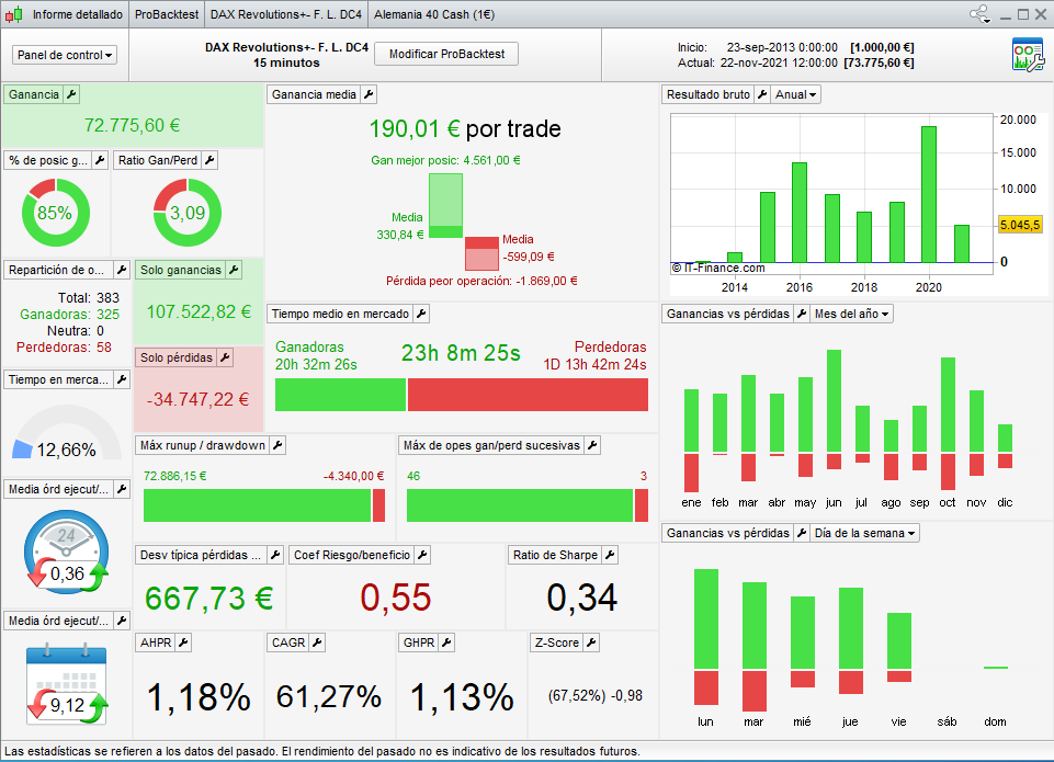 Trade the Dax index, in timeframe 15 minutes, long / short positions.
