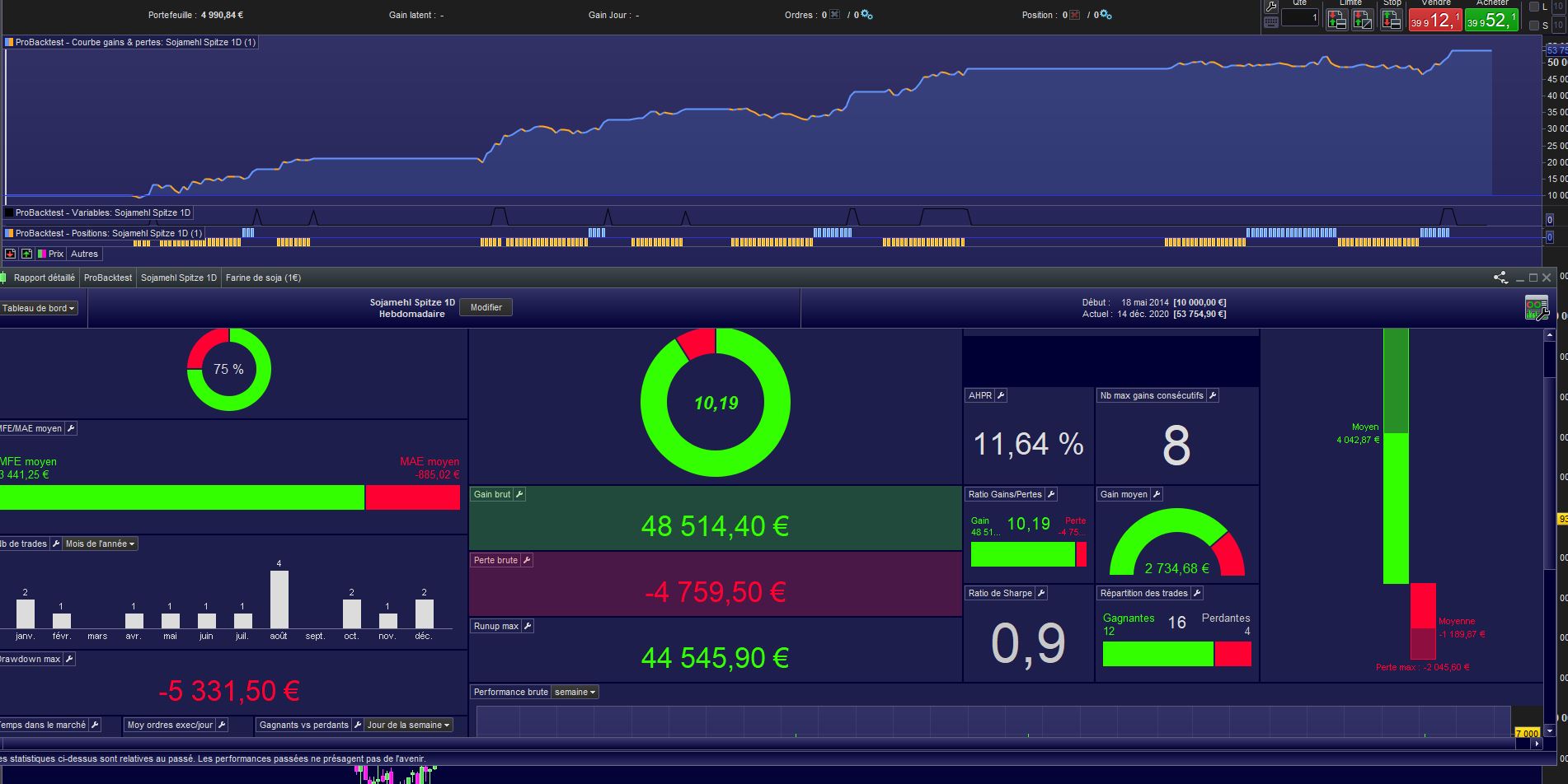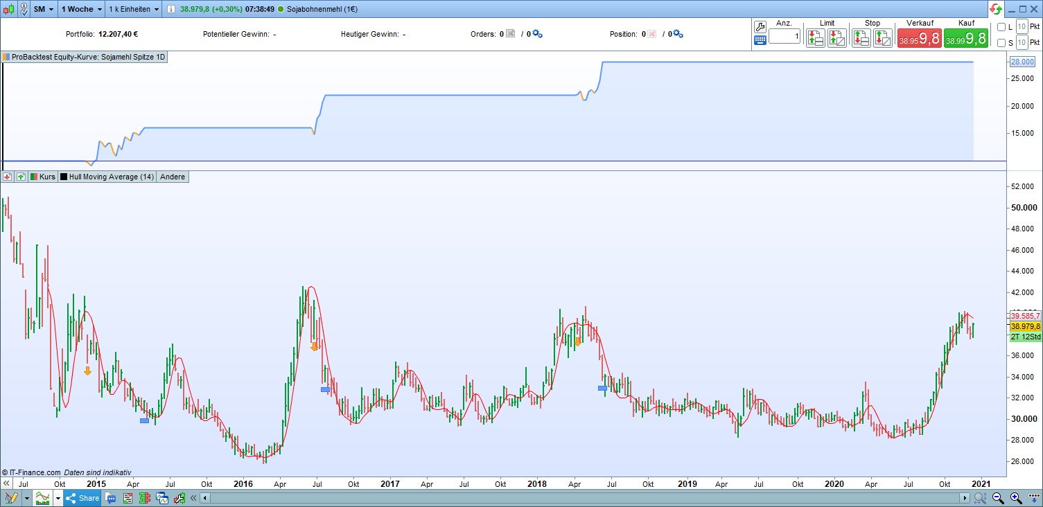 Aus aktuellem Anlaß habe ich heute ein Handelssystem für Sojabohnenmehl geschrieben. Es handelt short bei Spitzen. Ab einer gewissen Höhe und unter Verwendung des MA Hull wird eine short Position eröffnet.