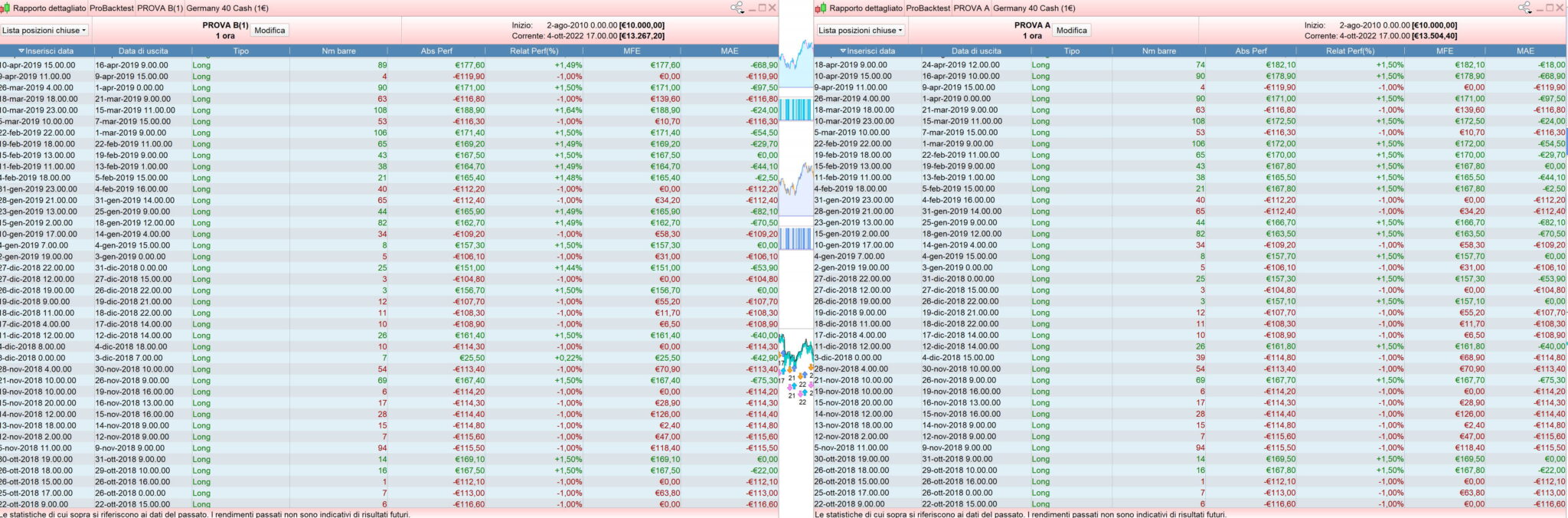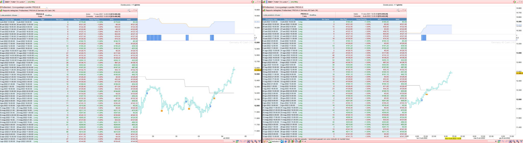 Ciao Roberto, ho provato a sostituire set target %profit X in una banale formule (test su cfd Dax 1 ora) ma i risultati non sono equivalenti. Probabilmente c’è qualche difformità nel calcolo della percentuale rggiunta nella formula B (ho provato a cambiare close con high, ma rimangono risultati differenti).