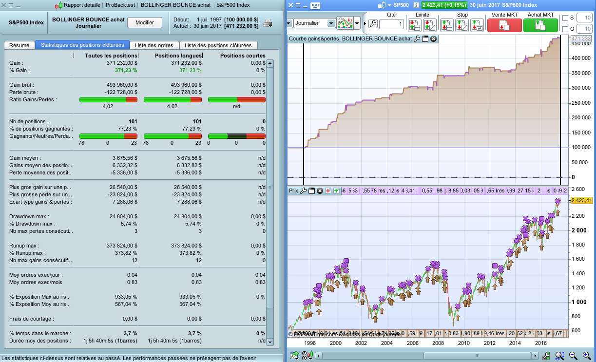 On the screenshot, the backtest was made without reinvesting the earnings, with a very correct profit factor (> 4).