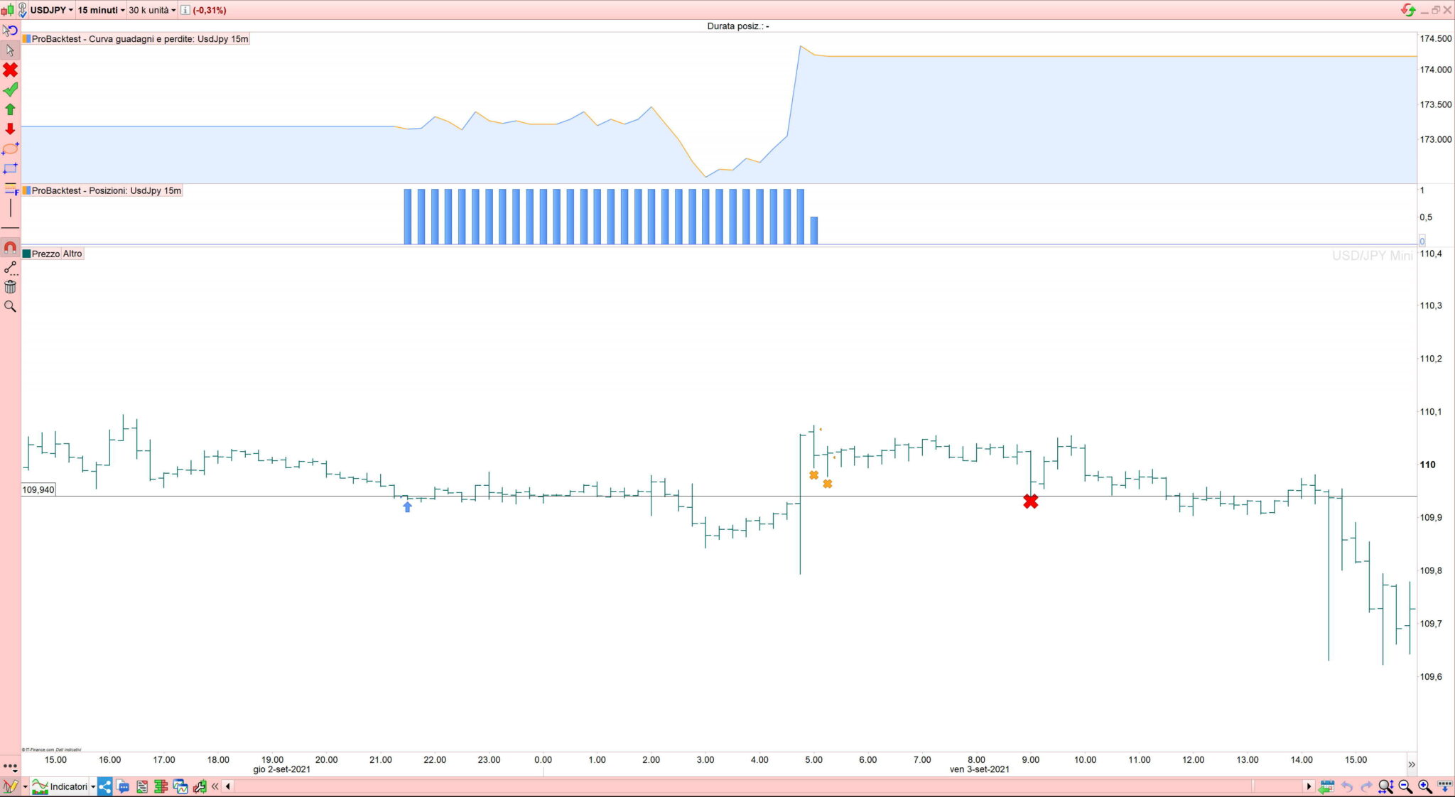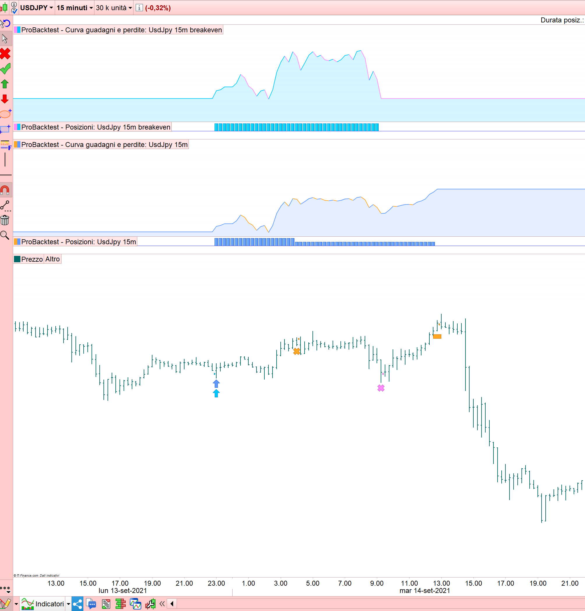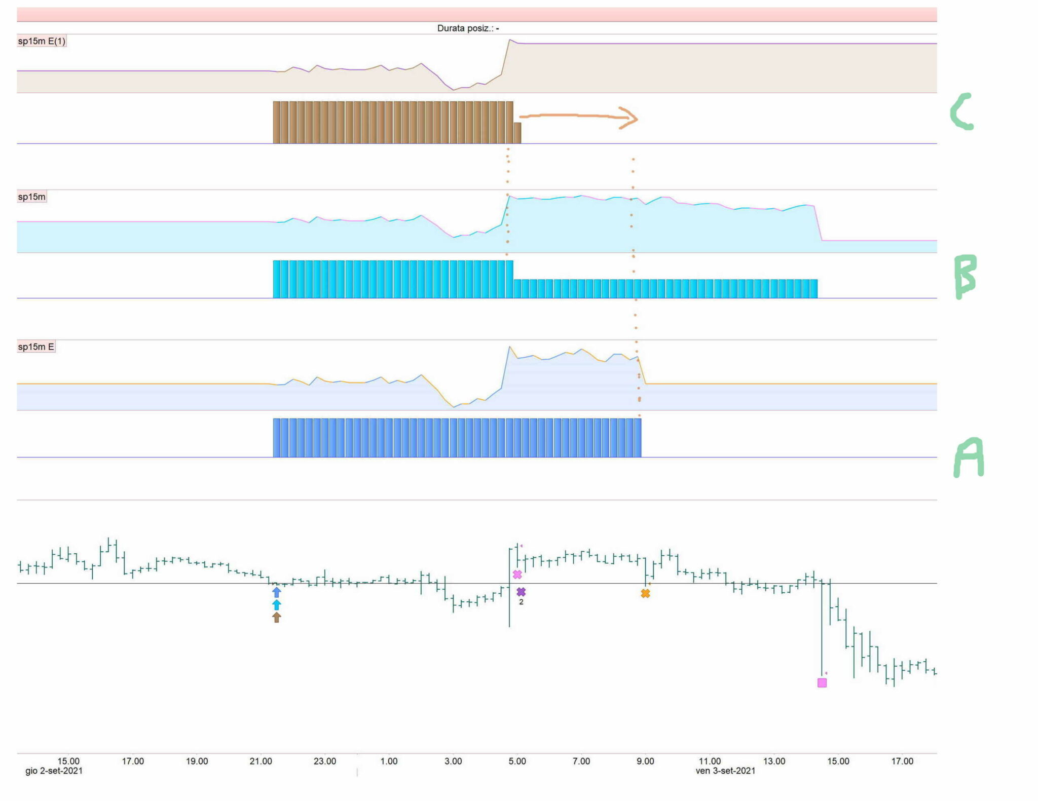 Guarda quest’altro esempio, come mai qui, che non chiude subito la posizione come sopra, poi non esce con la seconda parte a breakeven (X viola), ma molto dopo (rettangolo arancione) ? (operazione di lunedi 13 settembre ore 23).