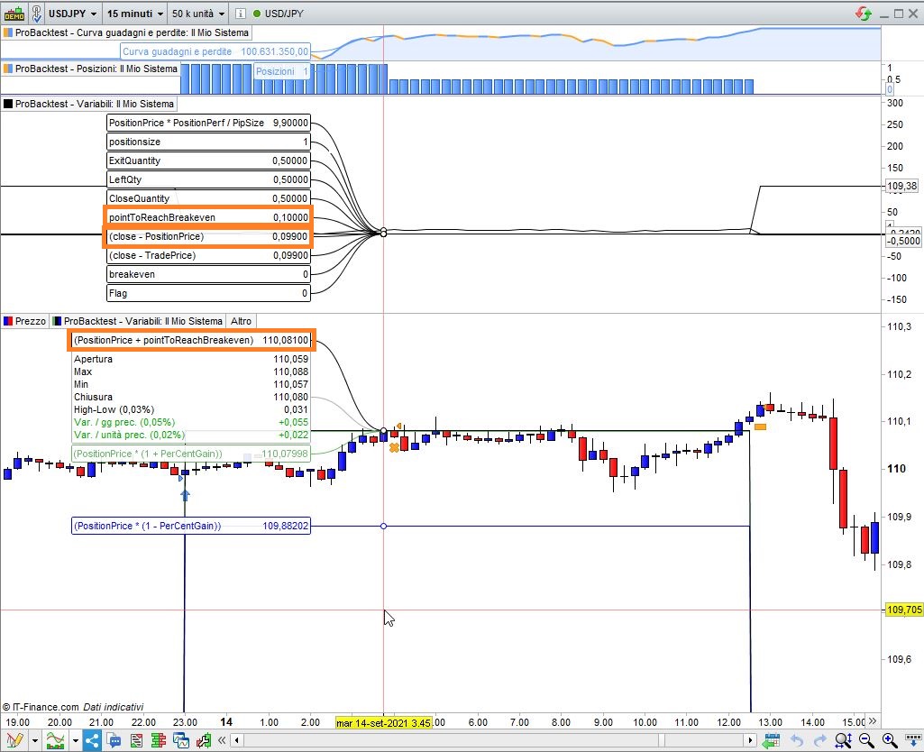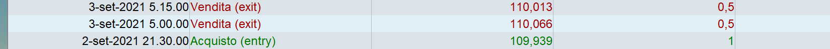 Ecco un altra immagine dell’ operazione sopra riportata. Il problema comunque è nella formula in generale che non chiude a breakeven la metà della posizione restante. Probabilmente i due codici (snippet) non vanno semplicemente assemblati come ho scritto.