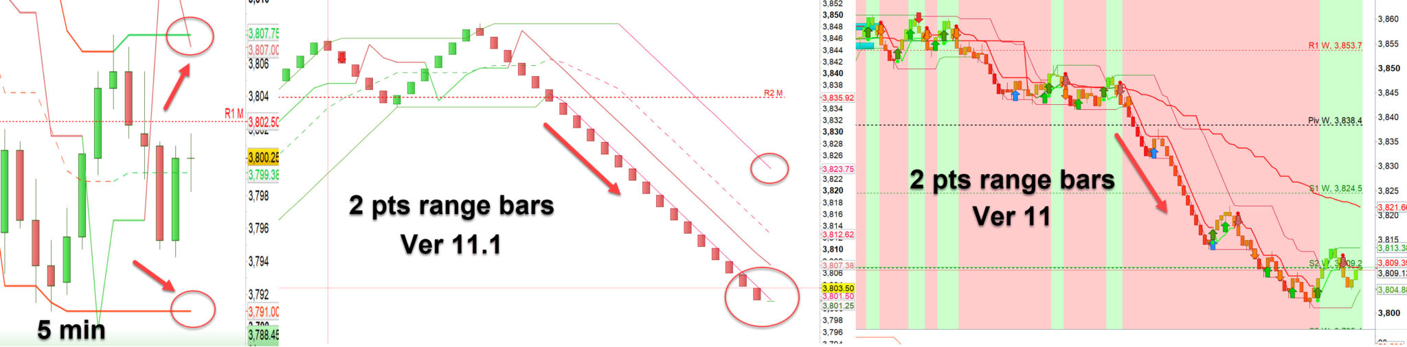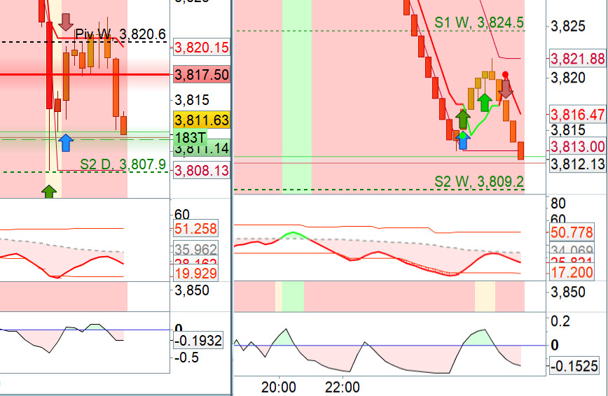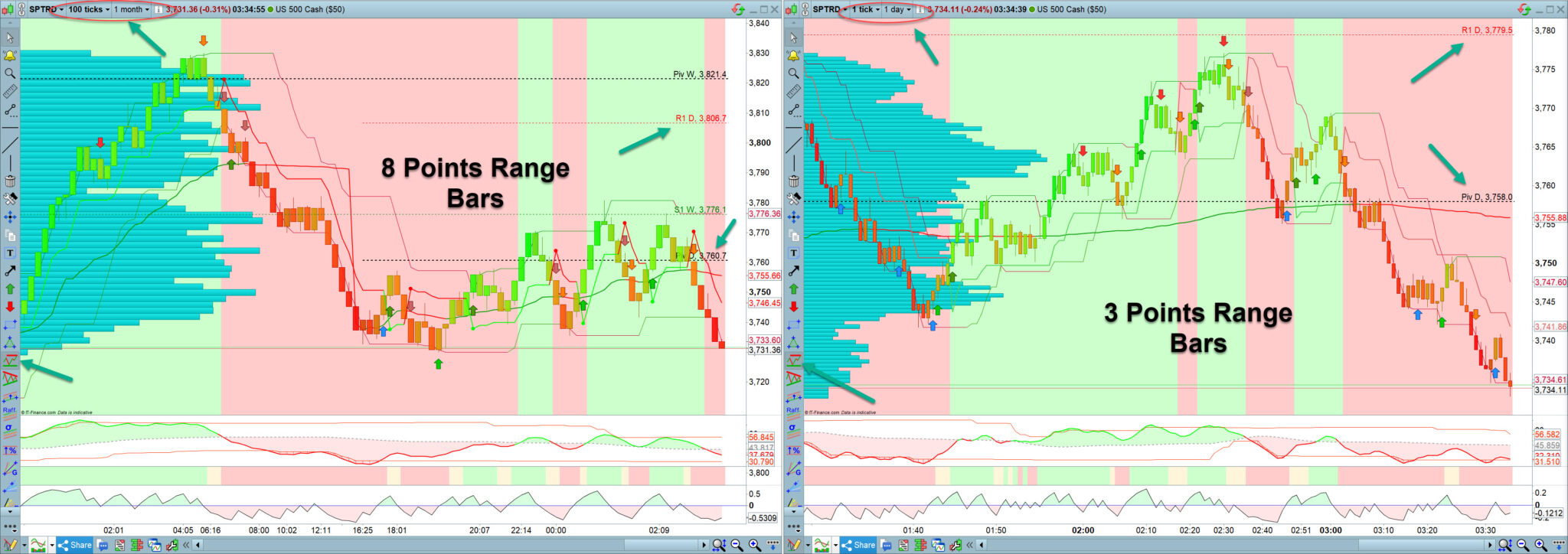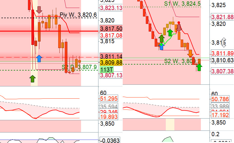 To the right a range bars chart 2 points for the US500 index, to the lift same index on 377 ticks chart, look at the low on the lift at the Donchain channel 3,808.13 and look at low on the right 3,813.