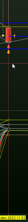 Knowing about this resemblance is very useful because you can see in Backtest the impact of spread. It may be hard to interpret, but the 3rd screenshot is the order from the previous post, now in backtest (see how the yellow triangle is quite at the same position as the red triangle) and see in the 4th screenshot the Gain of -2,31 which right at the exit of its first bar is thus still higher than a spread of 1 would be (1 would be 1 x 1.78 (positions) = 1.78, 2 would be 2x 1.78 = 3.56). The Ruler tool tells me that there is 0.6 points difference between the entry price and the exit of the bar, which is 0.6 * 1.78 = 1.068. 3.56 – 1.068 = 2.492 which is almost what my graph is telling me (2.31). Main point : the spread is here ~2 and not 1.