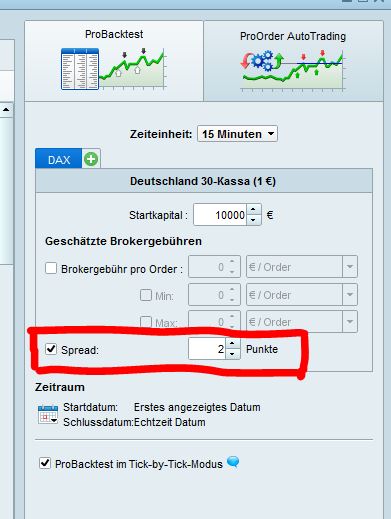 Ich kann den Spread manuell einstellen. Problem ist nur, dass je nach Urzeit der Ausführungen der Spread variiert. Diese Variation kann ich aber nicht in den ProBacktest einprogrammieren.