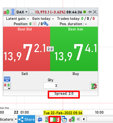 Der aktuelle Spread ist im Scalping-Fenster sichtbar, siehe beigefügtes Bild, um zu erfahren, wie man ihn bekommt.