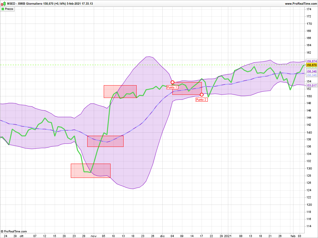 Buongiorno, ipotizziamo di creare uno spread con STOXX50 e FTSEMIB (solo un esempio). Agganciamo al grafico una Bollinger e usiamo i seguenti segnali: