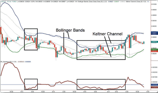 The attached pic shows all possible crossings of the Bollinger Bands over/under the Keltner Channel.