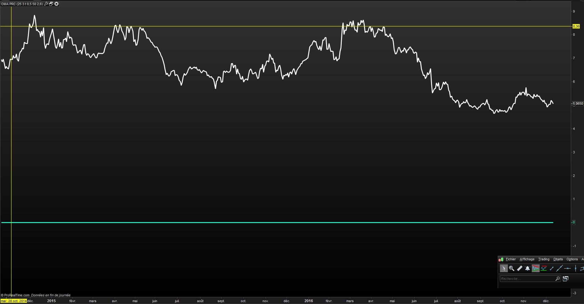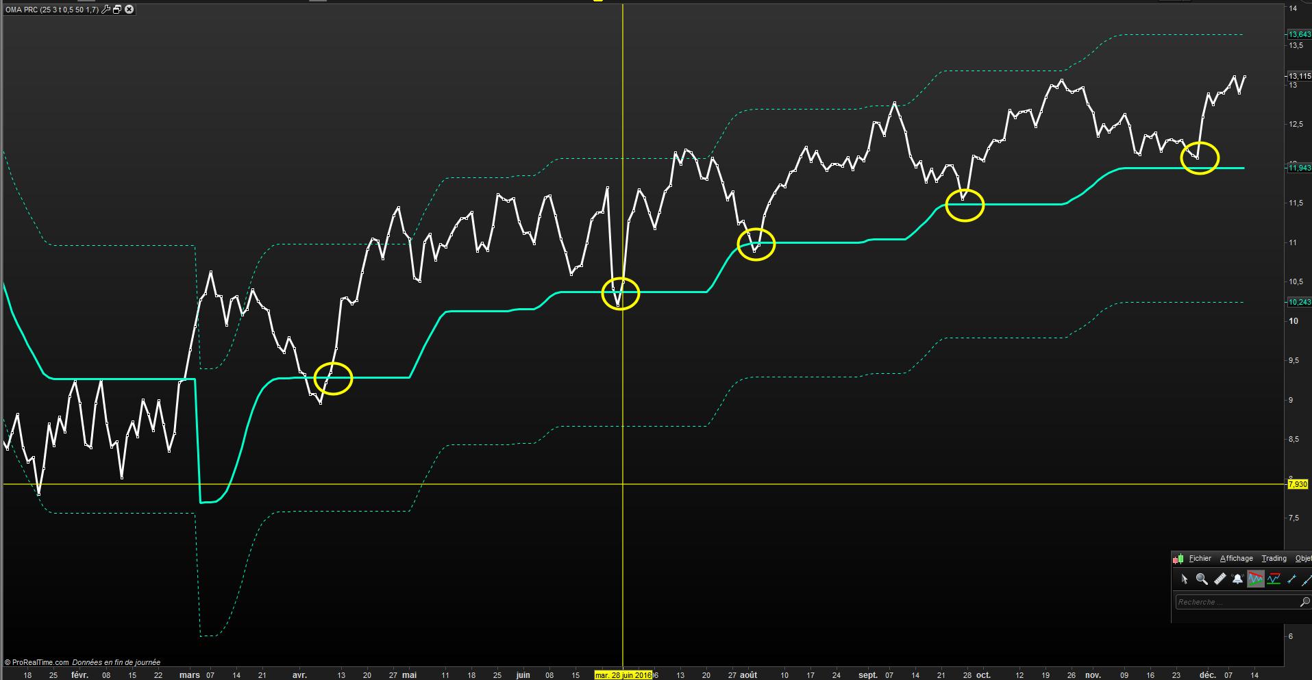 On peut rajouter 2 bandes ( hautes et basse ) sur l’indicateur OMA pour mieux “cerner” le trade.