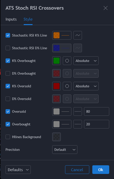 plotshape(checkOSPlot and kCrossUnder ? k : na, title=”K% Oversold”, color=green, style=shape.circle, location=location.absolute, size=size.tiny, transp=50)