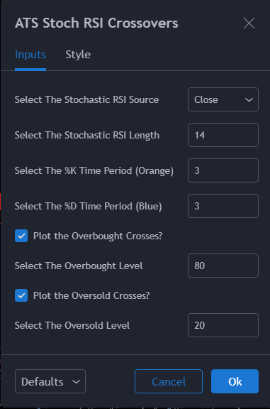 study(“Stochastic RSI”, shorttitle=”Stoch RSI Crossovers”, overlay=false)