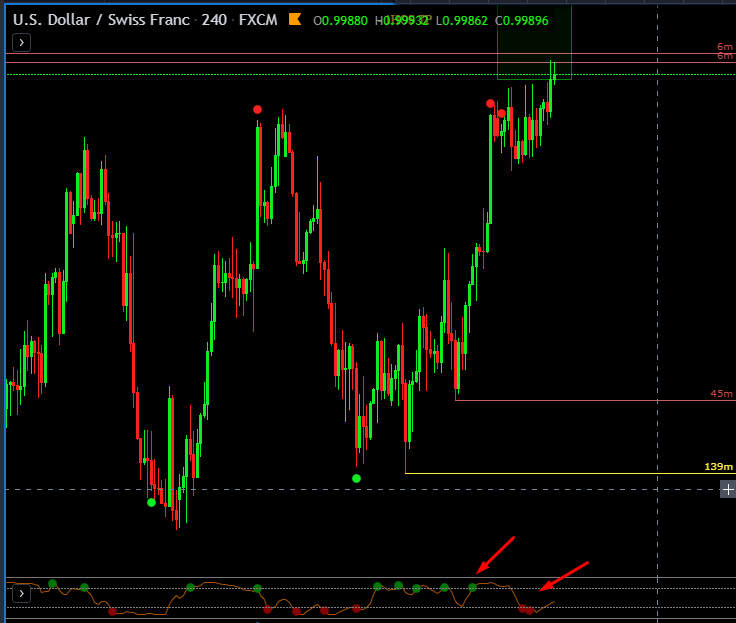 The indicator gives a dot in the indicator window when the rsi k line crosses up the 70 or down the 30 into overbought or oversold.