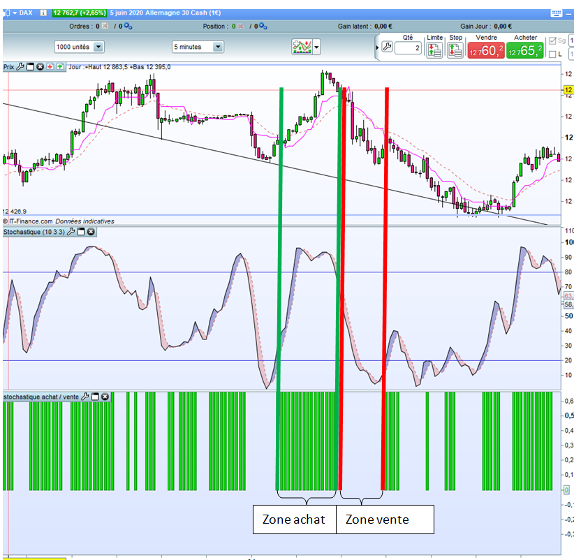 Condition 2 ==> Si K% en dessous de D% ou en dessous du niveau 20 Alors signa rouge (histogramme)