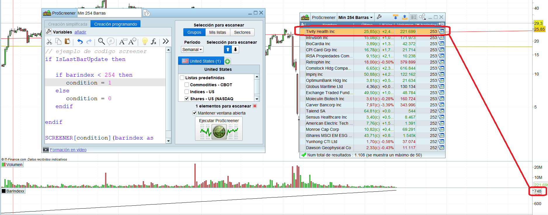 I’m working on a screener that gives me the total amount of bars and only selects the stocks with more than 254 bars. The code is this: