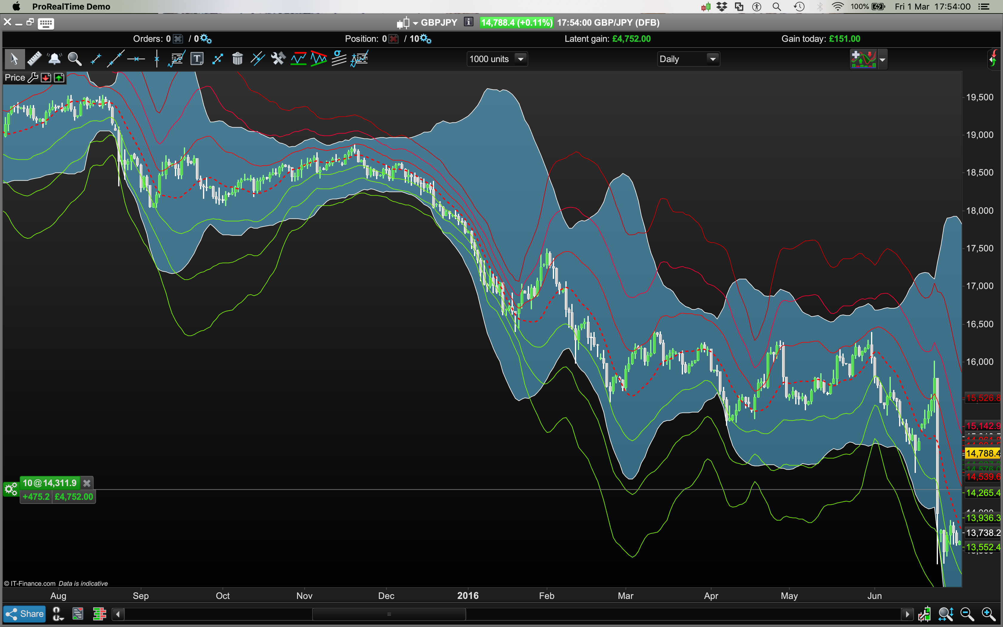When these bands narrow, be warned. (See GBP/Yen screenshot with overlay of a 30 day Bollinger at 3.6 Std Devs for comparison).