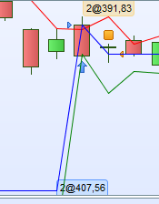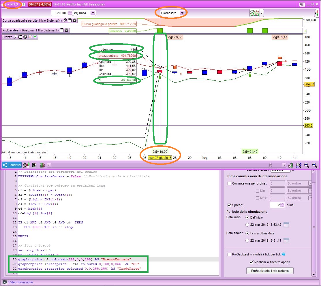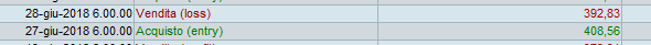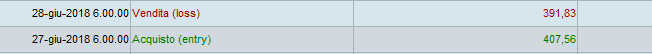 interessanti le 3 linee , devo studiarmele bene. Tuttavia non mi torna una cosa : a me segna che entra a mercato il 27 giugno 2018 al prezzo di 407,56 ( avendo giustamente superato il max della prima candela di setup 405,46 ) ed esce il 28 giugno 2018 al prezzo di 391,83 con una perdita.