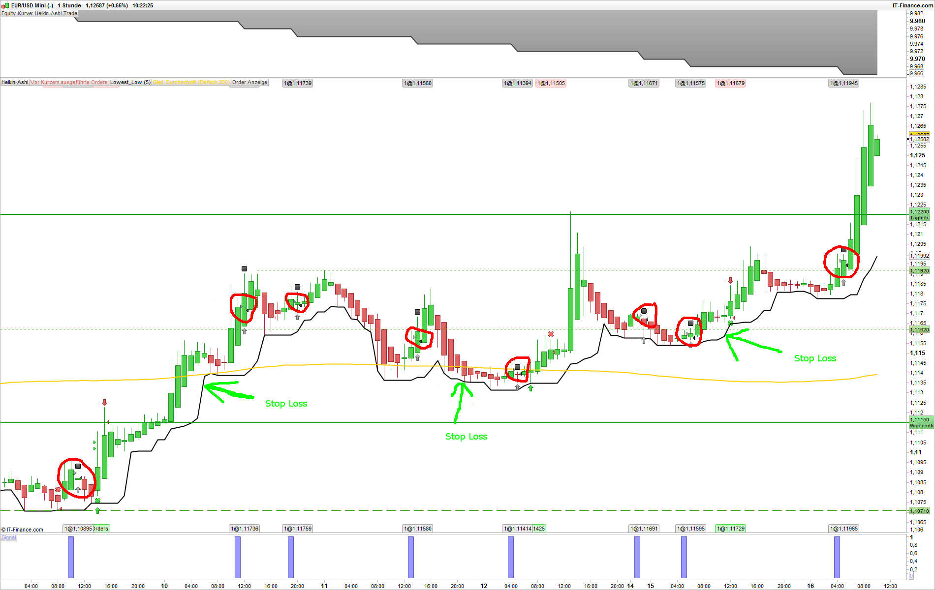anbei findet ihr einen PRT-Code für ein Handelssystem, welches auf den Wechsel der Heikin-Ashi-Kerzen basiert. Mein Problem ist das mein Stop Loss nicht funktioniert. Anhand der Bilder ist zu sehen, dass der Stop Loss nicht auf dem tiefsten Tief der letzten 5 Perioden gelegt wird. Der Stop Loss müsste auf der schwarzen Linie unterhalb der Heikin-Ashi-Kerzen liegen. Kann mir jemand sagen wo mein Fehler im PRT-Code liegt? Warum wird der Stop Loss nicht auf der schwarzen Linie platziert?