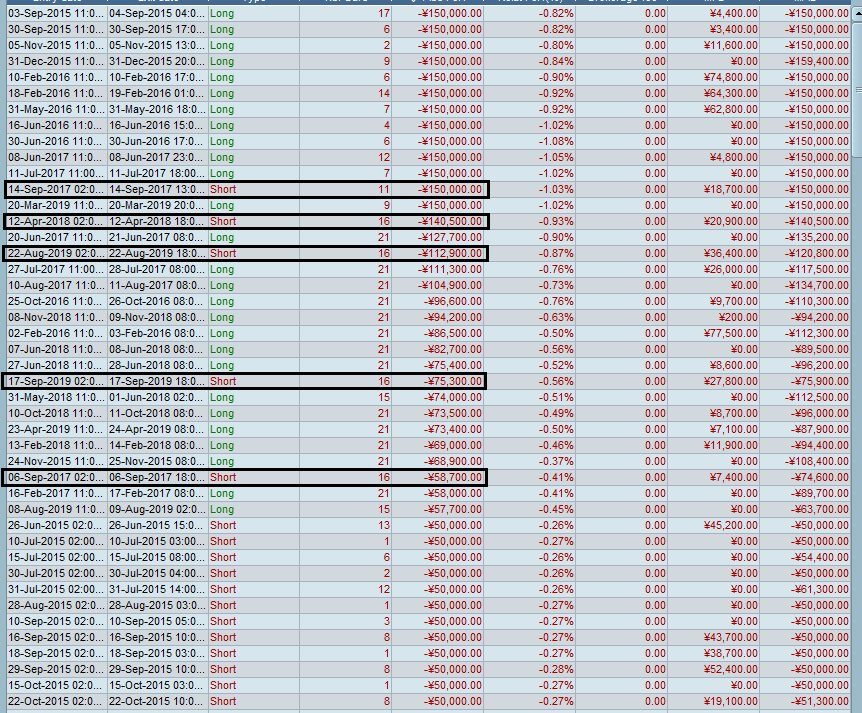 Allego blocco del codice in questione, il long è speculare e funziona correttamente con stop a 150000 ¥, lo short ha quelle operazioni in foto che non riesco a giustificare. Il test è fatto sia con tick-by-tick che senza e non cambia. Non ho aggiunto commissioni