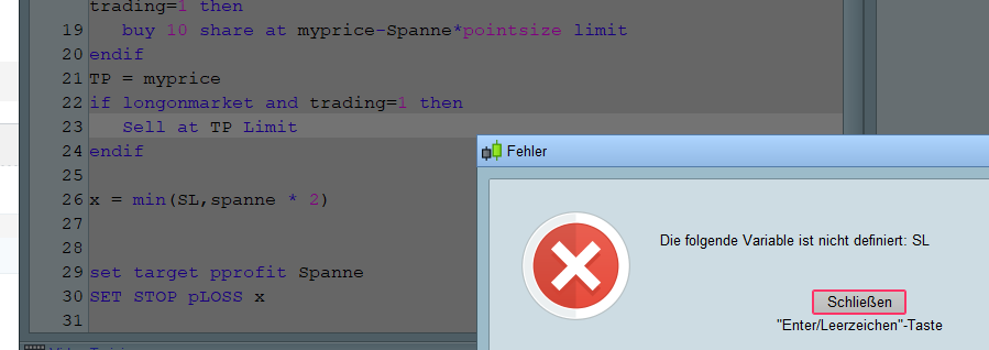 Ich brauche also eine Anweisung im Code die besagt, dass der STOP LOSS nicht größer als das doppelte Target sein soll. Sodass ich das Target als Variable vergeben kann.