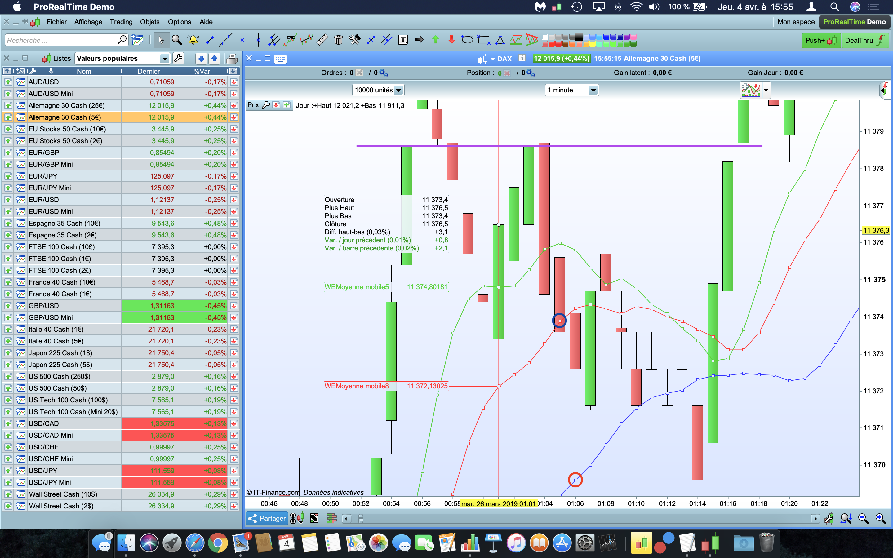 Je souhaite ouvrir une position au croisement à la baisse de la moyenne mobile rouge (symbolisé par le rond bleu sur la photo)